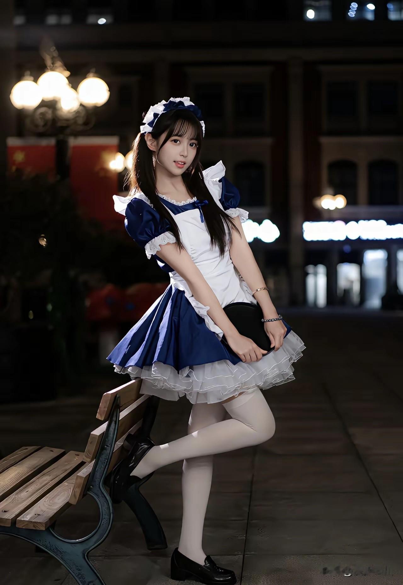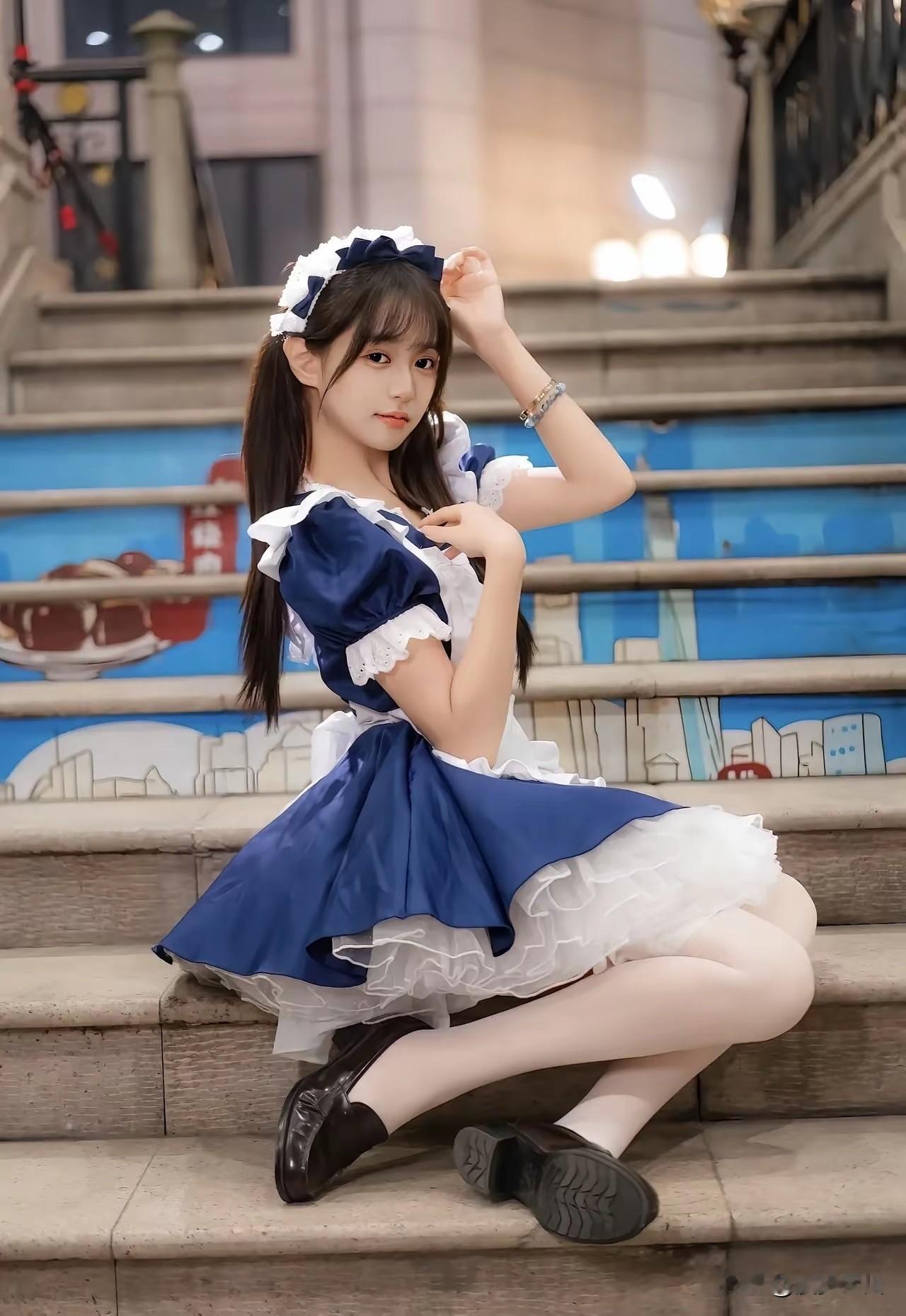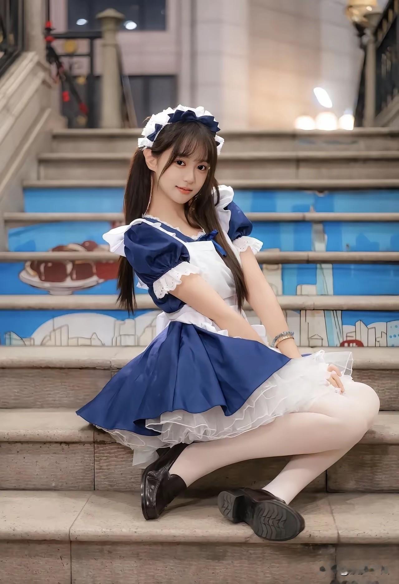 《台阶上的蓝》 蓝裙摆铺展在石阶 像一瓣刚落的鸢尾 蕾丝褶皱里 藏着未说出口的软 发箍上的白 是月光织的花边 指尖轻触领口 惊飞了暮色里的蝶 身后的彩绘墙 流淌着城市的碎片 暖黄灯影里 晚风被穿成了甜 石阶凉,裙角轻 时间在此处放慢了脚步 褶皱里的光 正悄悄酿成星子 图片来自网络,侵删