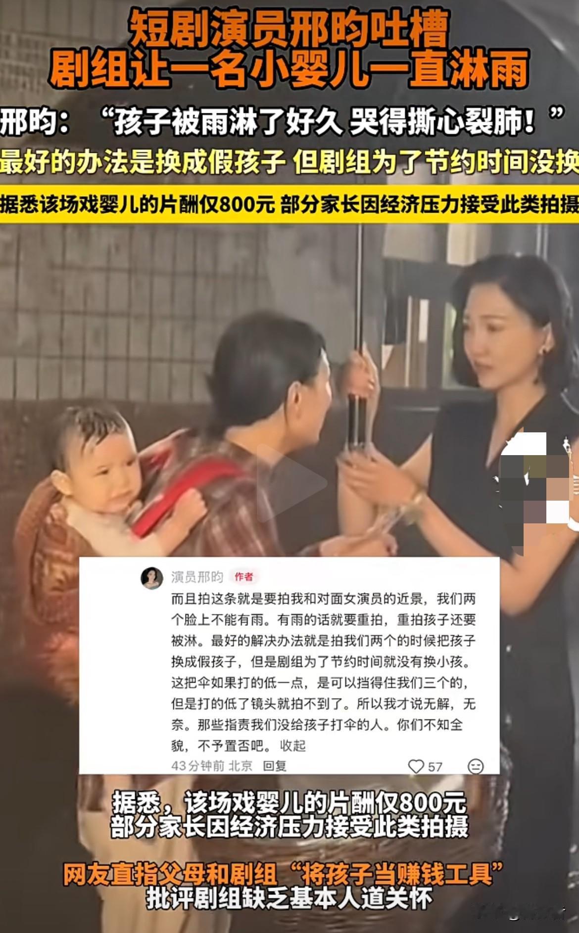 为了800块让小婴儿一直在雨里淋,孩子哭得撕心裂肺,短剧剧组真的太没底线了,心疼死了。邢昀说得太对,换个假孩子很难吗?又不是做不到。这剧组眼里只有节约时间,根本不管孩子的感受,这哪是拍戏,简直是在虐娃。而且这孩子片酬才800块,就遭这罪。这剧组为了利益,连最基本的人道都不顾了。多给孩子一些保护,别把他们当成赚钱工具。