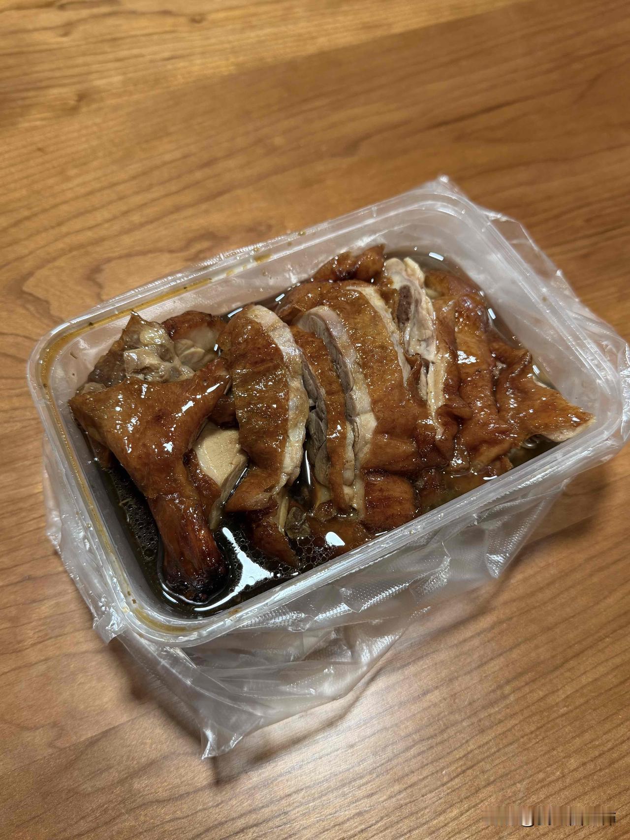 今天下班时候买到了楼下烤鸭店最后1/4烤鸭。 南京人都说自己小区门口的烤鸭最好吃,作为一个外地人,这一点我还没有体会过,我还是像一个游客一样,去市里的玩的时候就去排队买章云板鸭,徐家鸭子,陈林鸭子店等等。 当我搬到新的出租屋,发现小区门口有一家烤鸭店后,我第一时间去品尝了1/4前脯,味道意外的很不错,比我排队买的一些烤鸭还要香。 后来我经常下班的时候斩上1/4,但经常因为下班晚烤鸭已经卖光了。 连续几天想吃烤鸭没有吃到后,终于在今天下班买到了,正好剩一小份。平时老板会把卤汁分开装,今天我让她直接浇到了鸭子里,发现这样更香,更好吃了。 我决定以后都让老板把卤子浇到里面。 幸福的一天。