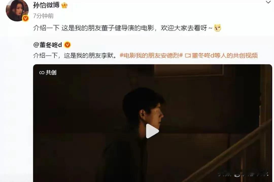 孙怡帮前夫新片打call!一句“我朋友”比电影台词还精彩 孙怡突然给前夫董子健的新电影吆喝,开口就是:“介绍一下,这是我朋友董子健导演的电影。” 董子健也秒回:“谢谢你,我的朋友。” 好家伙,离婚三年没动静,一开口就是“我的朋友”。这称呼,比他们演过的任何偶像剧台词都耐人寻味。电影叫《我的朋友安德烈》,现实里来了个“我的朋友董子健”,这宣传,妥妥的沉浸式体验。 不得不说,这大概是内娱离婚夫妻最“体面”的互动之一了。没撕没闹,还能顺手做个宣传。看来,从爱人变回“朋友”,中间隔着的,可能不止一部电影的距离。 孙怡为前夫董子健宣传新电影 董子健