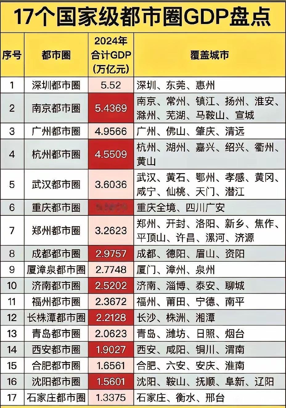 17个国家级都市圈GDP出炉:深圳都市圈南京都市圈相当、成都都市圈第8名、石家庄