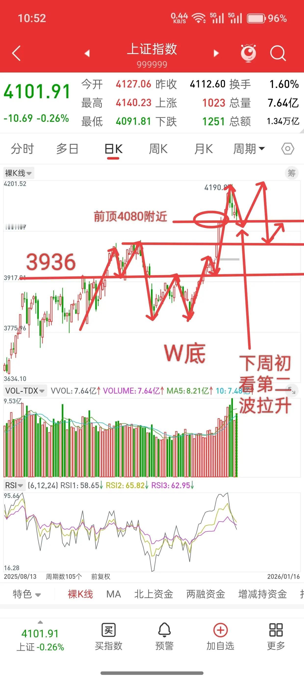 A股。明天1月19号(周一),点位预判来了。明天大盘,低开探底,盘中反抽,冲高回落,震荡概率大。 明天点位预判,低点4080点附近,高点4140点附近。下周很大概率去做双顶。 周末消息面,商业航天,谷神星二号民营商业运载火箭发射任务失利、还有长征三号乙运载火箭也发射失利了,你说这算不算利空。 商业航天基本没有业绩支撑,靠的就是讲故事,现在火箭发射失败,你说短期还能炒吗? 上周宽基净流出1920亿,双创和沪深300ETF,也在持续流出,这就是在压制盘面,防止涨幅过快。 利欧周四晚上,停牌核查,周五ai应用,利欧小弟,全部地板。海格、岩山、视觉、人民、金凤、三维,6支票被套1000多亿,短线1000亿资金出不来,加上其它地板的钱,这套住的资金了不少,对于短线就会承压,大盘震荡在所难免, 现在在4100点附近,还有人在持续加杠杆。周五融资余额又增加了200亿,融资余额已经达到将近2.7万亿,说明还是有很多人,看好后面的市场。