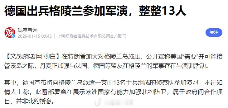 不是,闹呢?德国也太搞笑了。15日,德国向格陵兰派出了13人的超级军队抵御美军入侵格陵兰。18日,德国宣布,撤退!所以,德国的军队是来遛弯来了。烽火问鼎计划热点现场特朗普因格陵兰岛向欧洲8国加税