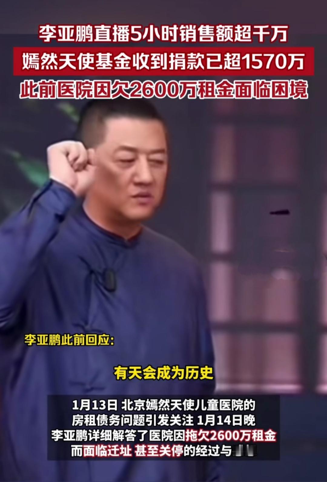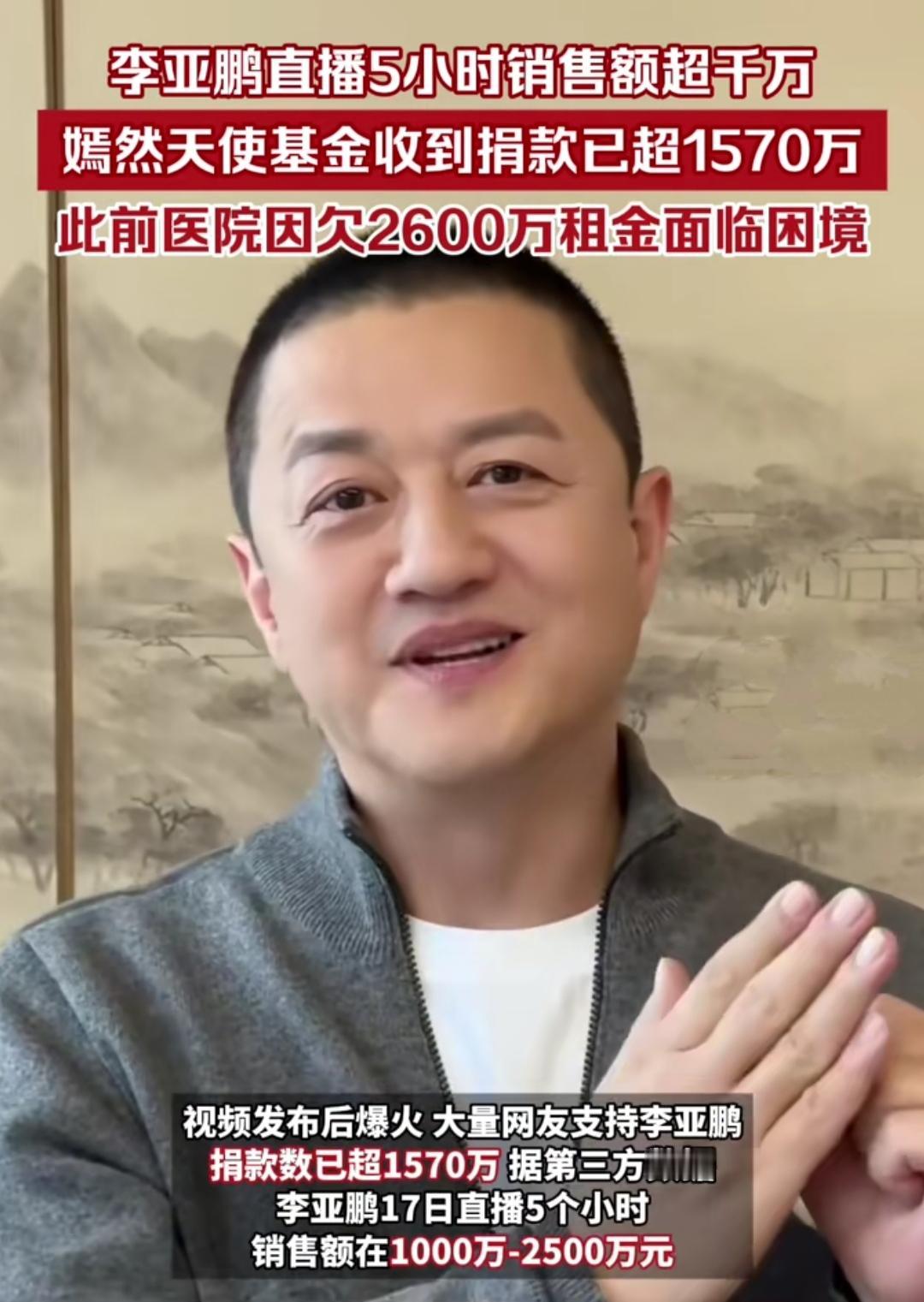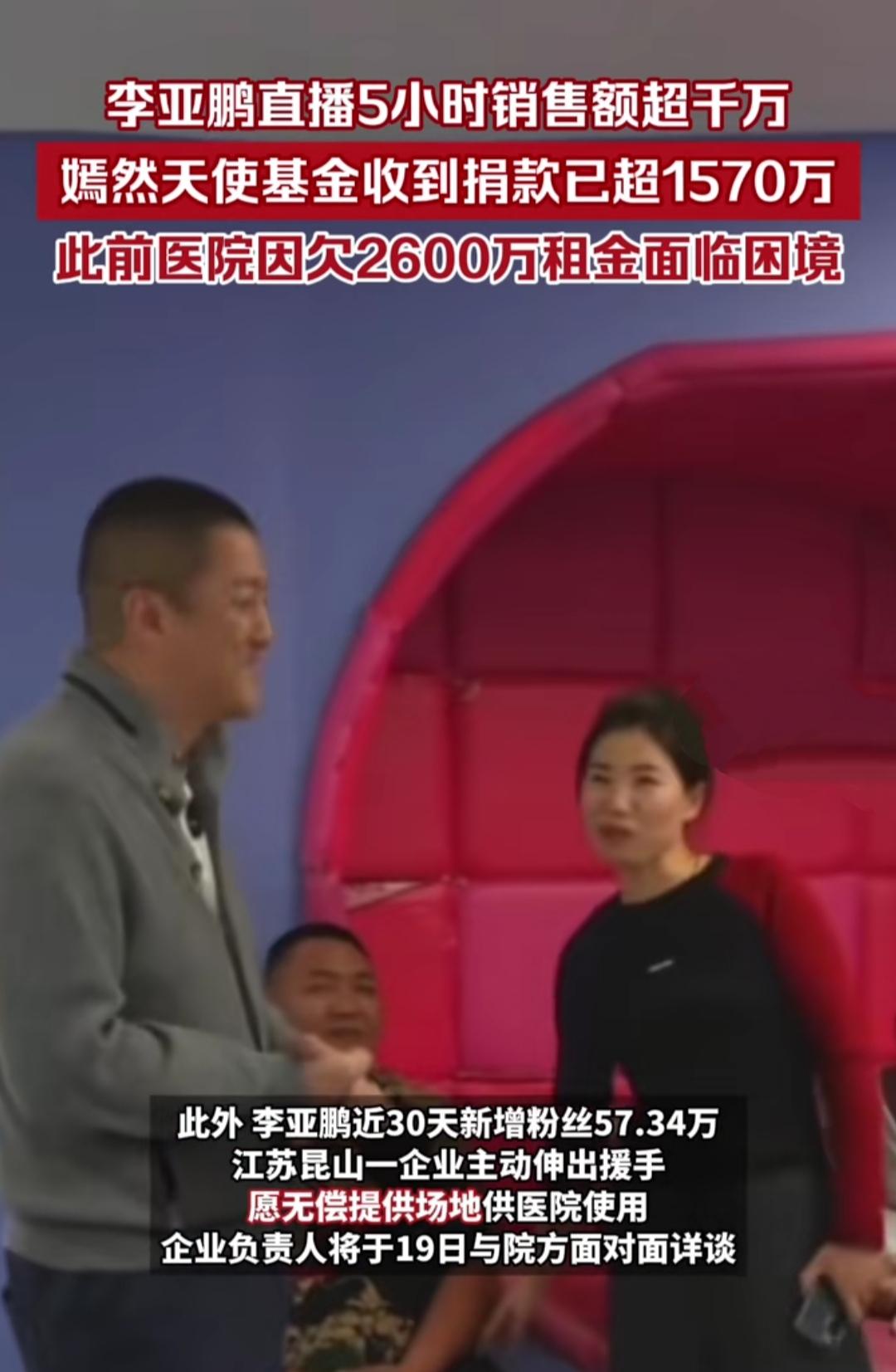 谁能想到,前几天还因为欠2600万租金要关门的嫣然天使儿童医院,突然有了转机——李亚鹏一场5小时直播,销售额直接破千万,加上网友的捐款,现在已经凑了1570万。 更暖的是,江苏昆山有家企业主动递了橄榄枝:“场地我们无偿提供,19号就来和院方面谈”。这几天他账号涨了57万粉,之前他说“困境总会成历史”,现在看这话正一点点落地。 其实大家愿意买单、愿意捐,不是冲明星,是疼那些等着看病的孩子。有人说“这才是带货该有的温度”,也有人惦记后续的资金透明。你觉得这场直播,是真心救医院,还是借善意攒流量?