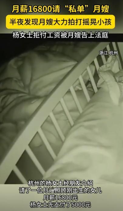 “还有良心吗?”浙江杭州,女子坐月子和丈夫睡一个屋,花16800元请的月嫂和婴儿睡一屋。凌晨丈夫听见孩子一直哭闹不停,从监控中竟看到月嫂在疯狂拍打孩子!夫妻俩立刻把孩子送去医院检查,检查结果显示,孩子脑后有积液,是躯体虐待导致的。事后,夫妻俩立刻辞退月嫂,没进一步追究月嫂的问题,但月嫂却把夫妻俩起诉了,要求支付未结算的工资,小两口气坏了,决定反制!   “花钱买安心”是很多新手父母请高价月嫂时的朴素想法,但杭州杨女士夫妻俩的遭遇,却给这个想法泼了一盆刺骨的冷水。   月薪16800元,在杭州月嫂市场已属中高端价位,本以为能换来专业细致的照料,没想到却让刚出生几十天的宝宝遭遇了躯体虐待,更令人愤怒的是,施暴者事后竟倒打一耙索要工资。   这场始于信任的雇佣关系,最终演变成对簿公堂的纠纷,背后暴露的不仅是个人良知的缺失,更是整个母婴护理行业的深层乱象。   杨女士产后坐月子期间,为了能安心休养,也给新生儿最好的照顾,通过朋友介绍找到了月嫂。   对方简历上赫然写着“母婴护理高级专业能力”认证,言谈间也反复强调自己“爱孩子、有经验”,这让夫妻俩放下了最初的顾虑。   双方签订了两个月的服务合同,约定每月工作26天,夫妻俩先行支付了5000元定金,满心期待着专业人士能帮他们度过这段手忙脚乱的时期。   第一个月的服务确实没出什么岔子,月嫂的日常照料看似周到,夫妻俩渐渐放松了警惕,甚至觉得这笔高价服务费花得值。   平静在第二个月的一个凌晨被彻底打破,凌晨三点多,熟睡中的丈夫被婴儿房传来的持续哭闹声惊醒,那哭声尖锐又虚弱,和平时的撒娇哭闹截然不同,让他瞬间心头一紧。   他赶紧拿起手机连接婴儿房的监控,屏幕上的画面让他浑身血液几乎凝固。   月嫂背对着门口,双手用力地拍打宝宝的后背和臀部,动作又快又重,随后还把孩子裹在被子里继续拍打。   见孩子哭得更凶,她又将孩子放在自己腿上像颠皮球一样晃动,最后甚至直接摇晃孩子的头部,整个施暴过程持续了近五分钟。   夫妻俩疯了一样冲进婴儿房,抱起孩子时发现宝宝的小身子还在不停发抖,一碰到爸妈的手就哭得更凶,眼神里满是恐惧。   他们来不及和月嫂争执,连夜带着宝宝赶往医院检查。   诊断结果让杨女士当场落泪,检查报告显示宝宝后颅窝有少量积液,诊断书上明确标注“躯体虐待导致”。   医生看着监控画面也颇为震惊,直言小婴儿头骨尚未发育完全,这样剧烈的摇晃和拍打,很可能造成不可逆的脑损伤,后续还需要持续观察随访。   证据确凿之下,月嫂当场跪倒在地哭泣求饶,声称自己孩子要考试、有前途,恳求夫妻俩不要报警。   看着对方声泪俱下的模样,又心疼孩子需要静养,夫妻俩一时心软,只当场辞退了月嫂,拒绝支付剩余工资,没有立刻追究其法律责任。   他们以为给对方留了余地,事情就能就此了结,可没想到,这份宽容换来了更过分的挑衅,几天后,法院的传票寄到了杨女士家中,起诉人正是那位施暴的月嫂。   她以“无故辞退”为由,要求夫妻俩支付剩余24876.9元服务费,甚至把自己实施虐待的那几天也全部计入工时,一分钱都不肯少要。   在她的逻辑里,虐待孩子只是工作中的“小问题”,而雇主拖欠工资才是“实质性伤害”,这种颠倒黑白的认知,彻底点燃了夫妻俩的怒火。   原本只想息事宁人的他们,决定收集证据全力反制,不仅要拒绝支付工资,还要追究对方的医疗费、精神损失费等相关责任,给孩子一个交代。   杨女士夫妻俩目前已经收集好监控视频、医院诊断报告等完整证据,准备应诉。   他们的维权之路,不仅是为了给自己的孩子讨回公道,更是为所有新手父母敲响警钟:面对此类恶行,一味退让只会纵容施暴者,唯有坚决维权才能遏制歪风。   从花钱买安心到花钱买伤害,杭州这起月嫂虐婴案给所有家庭提了个醒:再高的价格,也买不来人的良心。   那些靠花钱就能买到的证书,撑不起专业的服务;那些看似周到的表面功夫,藏不住内心的冷漠。   要想让每个新生儿都能在安全的环境中成长,让每个家庭都能真正放心,仅靠家长的警惕远远不够。   相关部门需要落实监管责任,完善行业标准,建立月嫂黑名单制度,让那些持假证、失良知的从业者彻底退出行业;家政公司要切实履行审核培训义务,不能只做“中介”就万事大吉。   只有把制度的笼子扎紧,提高作恶的成本,才能让母婴护理行业回归“护理”的本质,才能真正守护好每个家庭的希望。