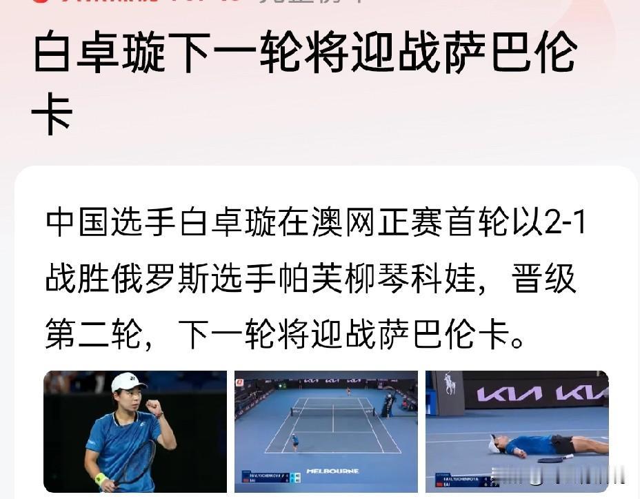 白卓璇的签运太背了,好不容易晋级澳网第二轮, 就遇到世界第一萨巴伦卡 从资格赛闯进澳网正赛的白卓璇,在第一轮就遇到网球高手帕芙柳琴科娃 经过三盘缠斗,最后凭借决胜盘的出色发挥,白卓璇2:1战胜对方,爆冷晋级第二轮 但是,在第二轮就遇到世界第一萨巴伦卡,这签运也太背了 不过,能挑战世界第一萨巴伦卡,也是难得的机会 如果能继续爆冷一下,那将会是澳网最大的冷门 希望白卓璇做好准备,毕竟自古英雄出少年 希望白卓璇能够初生牛犊不怕虎 ,能将世界第一萨巴伦卡挑落马下 那才叫做涅槃重生