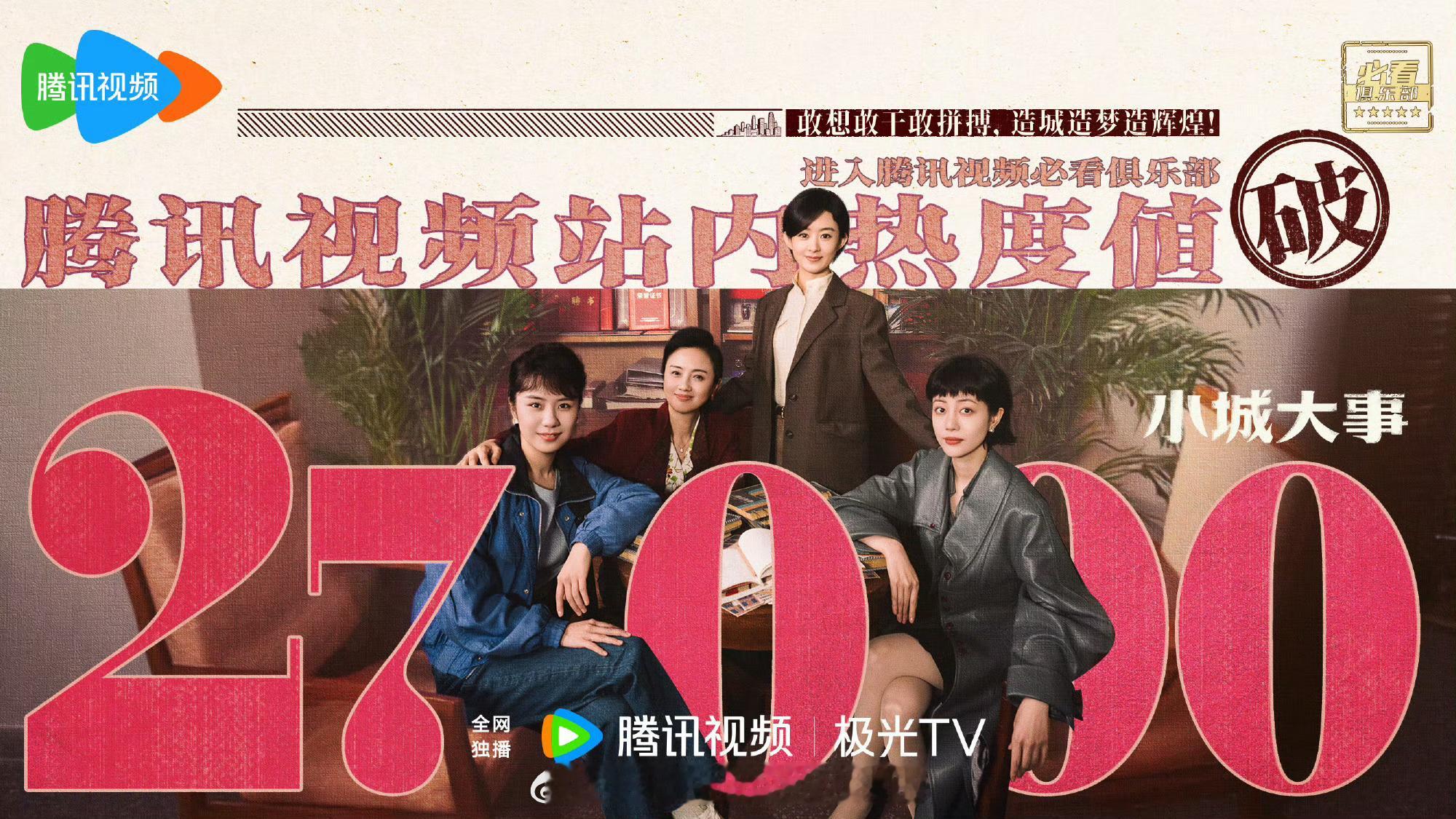 赵丽颖《小城大事》双集收视峰值均破2.5,今天酷云均值2.0984,是近几天新高。腾讯站内热度也稳步上升到27000小城大事热度破27000小城大事