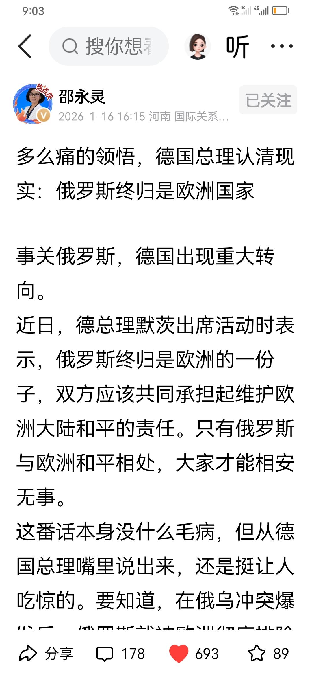 德国总理转身? 他说俄罗斯是欧洲一分子,应共同维护欧洲的和平。 法国马克龙也曾发出想与俄罗斯一谈的讲话。 意大利梅洛尼也有意。 匈牙利欧尔班巴不得。 英国最顽固反俄。 乌克兰泽连斯基要闪瞎眼:怎么回事?(他是犹太人)。 美国川普可能会要开骂,也许无所谓。 也许是川普索要格陵兰,终于让默茨看清了川普嘴脸。 联俄的好处太多: 一,缓和东方关系。 二,获得俄罗斯能援。 三,对抗美帝国。 但也要防俄罗斯过分强大。 这分寸的把握很难。