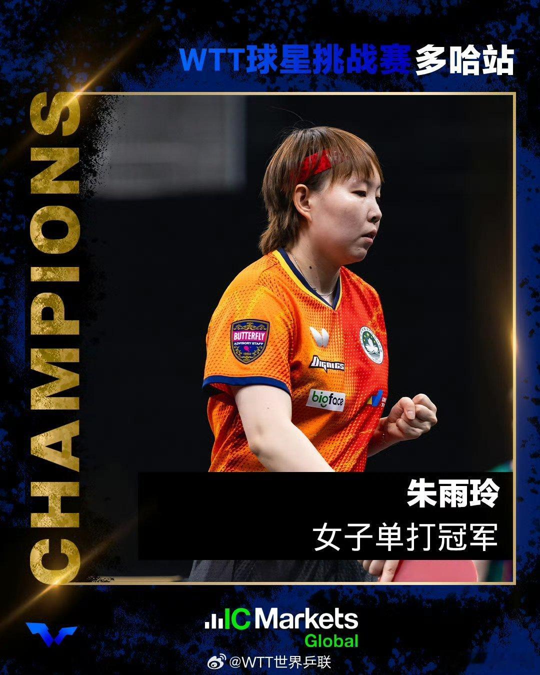 朱雨玲7天两冠朱雨玲WTT多哈站夺冠先丢两局,连扳四局!面对佐藤瞳的削球强守,朱雨玲稳扎稳打、耐心周旋,最终4-2强势逆转夺冠!短短七天,连夺多哈冠军赛与球星挑战赛两冠,状态火热,势不可挡恭喜朱雨玲,用实力宣告回归,我们下个赛场见!乒出精彩