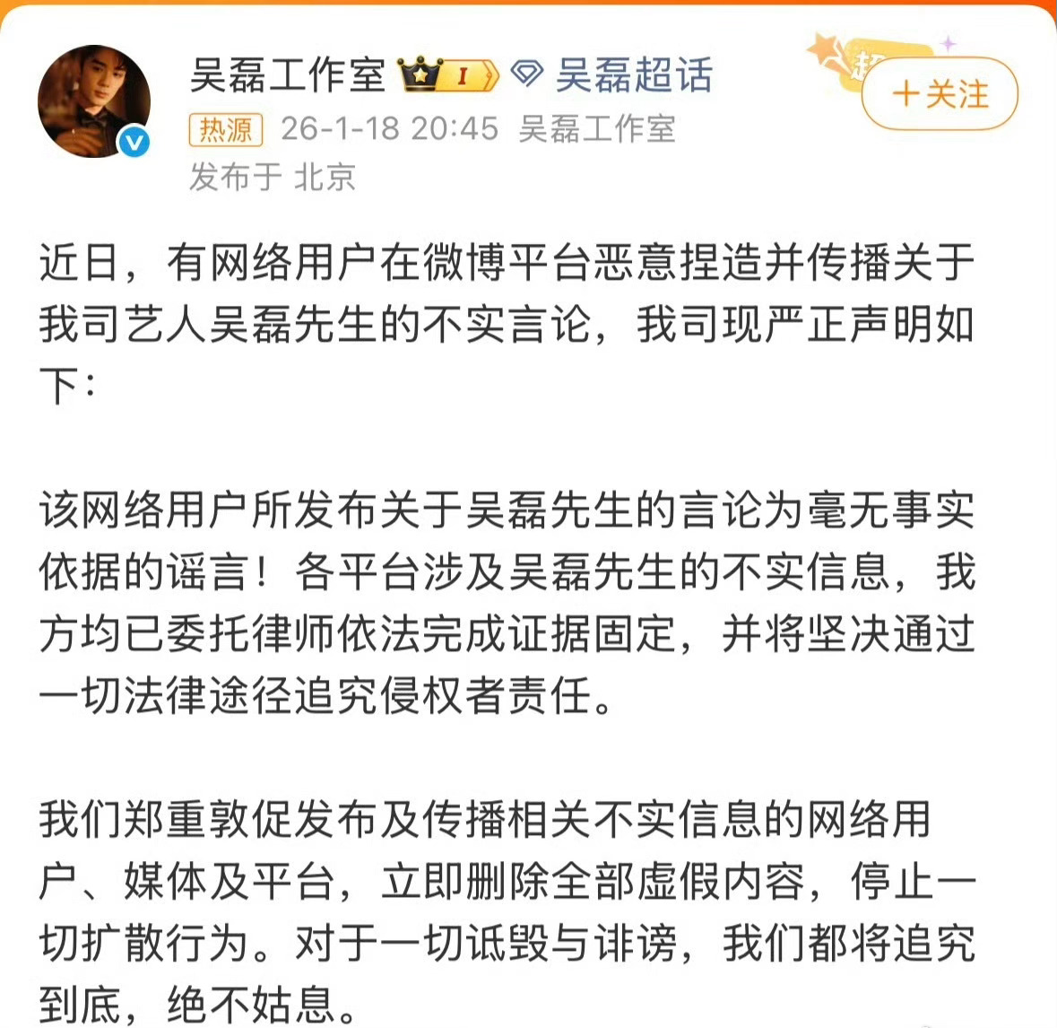 网友白珊珊a 发文喊话吴磊,随后吴磊工作室发声明了!吴磊工作室严正声明