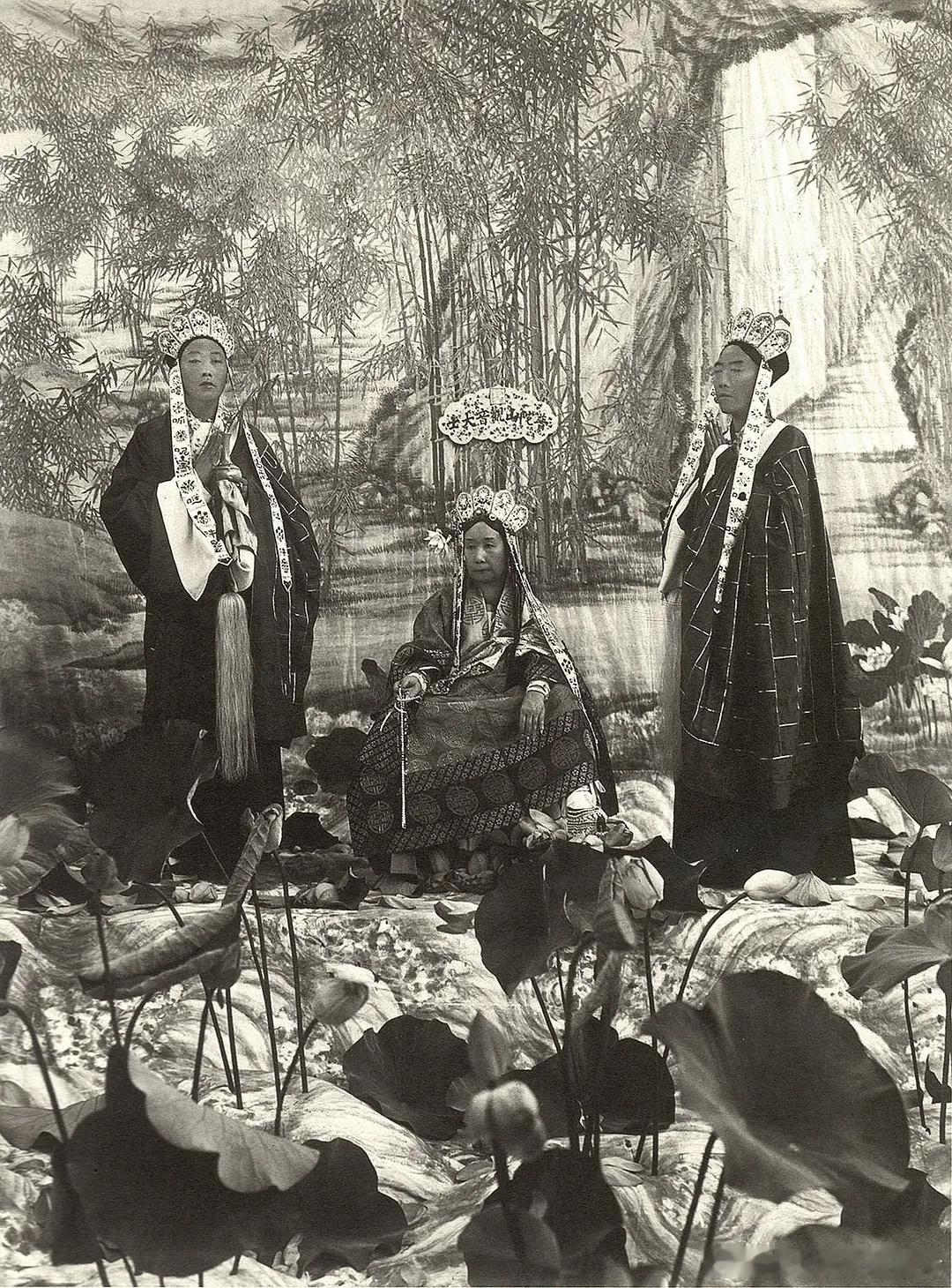 1903年,慈禧在颐和园留影,左侧站立者是太监崔玉贵,右侧站立者是太监李莲英。这是慈禧晚年拍摄的“cosplay”,她自比“救苦救难的观音菩萨”,身边的太监则扮作“护法”。