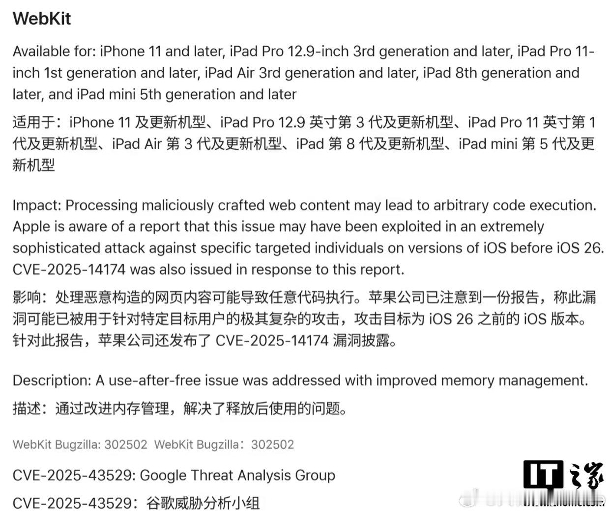 【苹果督促iPhone用户更新至iOS26.2】 1 月 19 日,苹果在官网发布公告,敦促 iPhone / iPad 用户尽快更新系统至最新版本,旧版本系统中存在“极其复杂”的 WebKit 安全漏洞,尚未安装最新更新的用户将面临严重安全风险。具体来说,相应漏洞为 CVE-2025-43529 和 CVE-2025-14174,由谷歌威胁分析小组(Google Threat Analysis Group)发现,并已遭黑客利用。据苹果描述,WebKit 安全漏洞可被攻击者利用,通过诱导用户访问恶意网页,从而在设备上执行任意代码,接管手机的部分功能,不过苹果并未披露黑客攻击的具体目标及受影响设备的数量。苹果表示,相关安全补丁已在新款机型适用的 iOS 26.2 以及较旧机型适用的 iOS 18.7.3 中修复,新版本通过改进内存管理和验证机制,彻底阻断了恶意网页内容触发“任意代码执行”的风险。并建议用户在完成更新后重启设备,以降低短期内遭受攻击的风险。(IT之家)