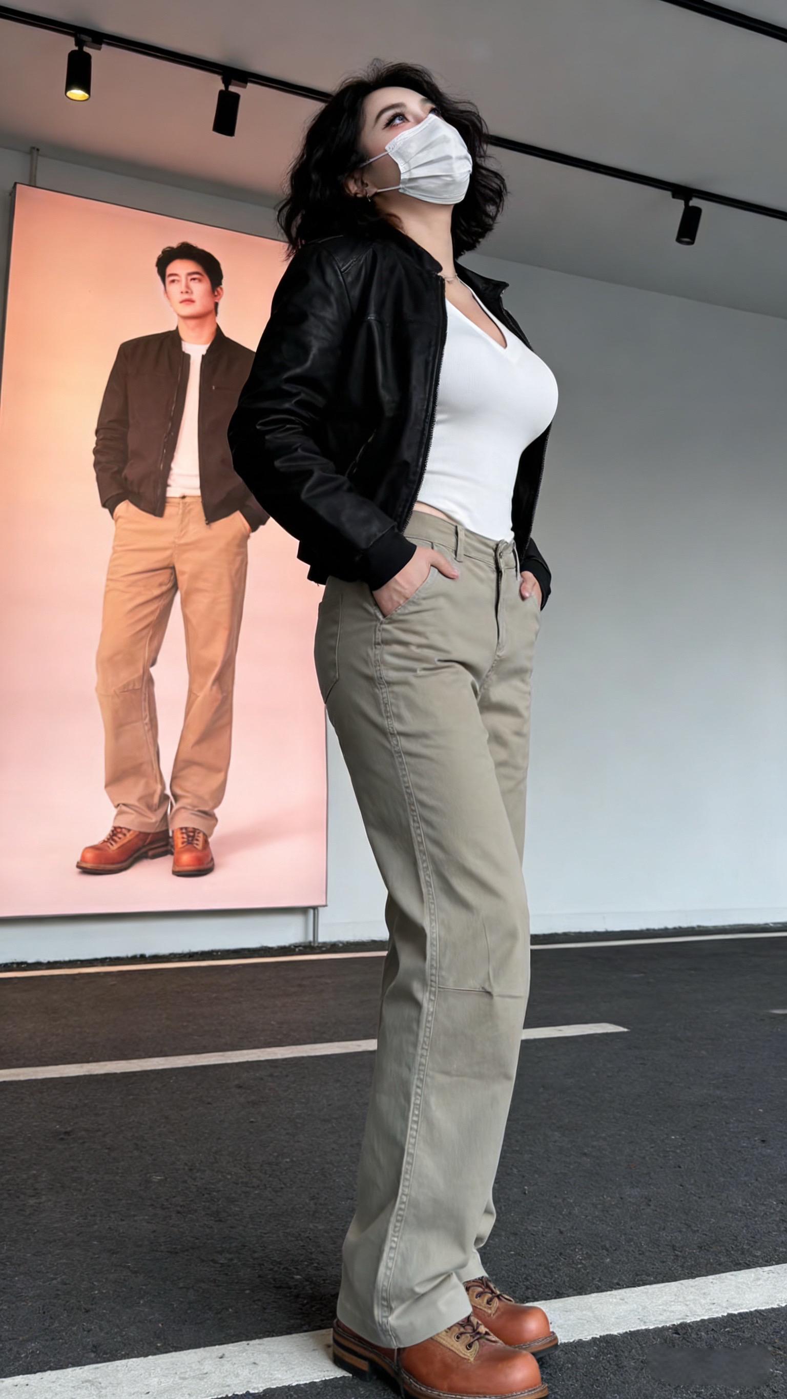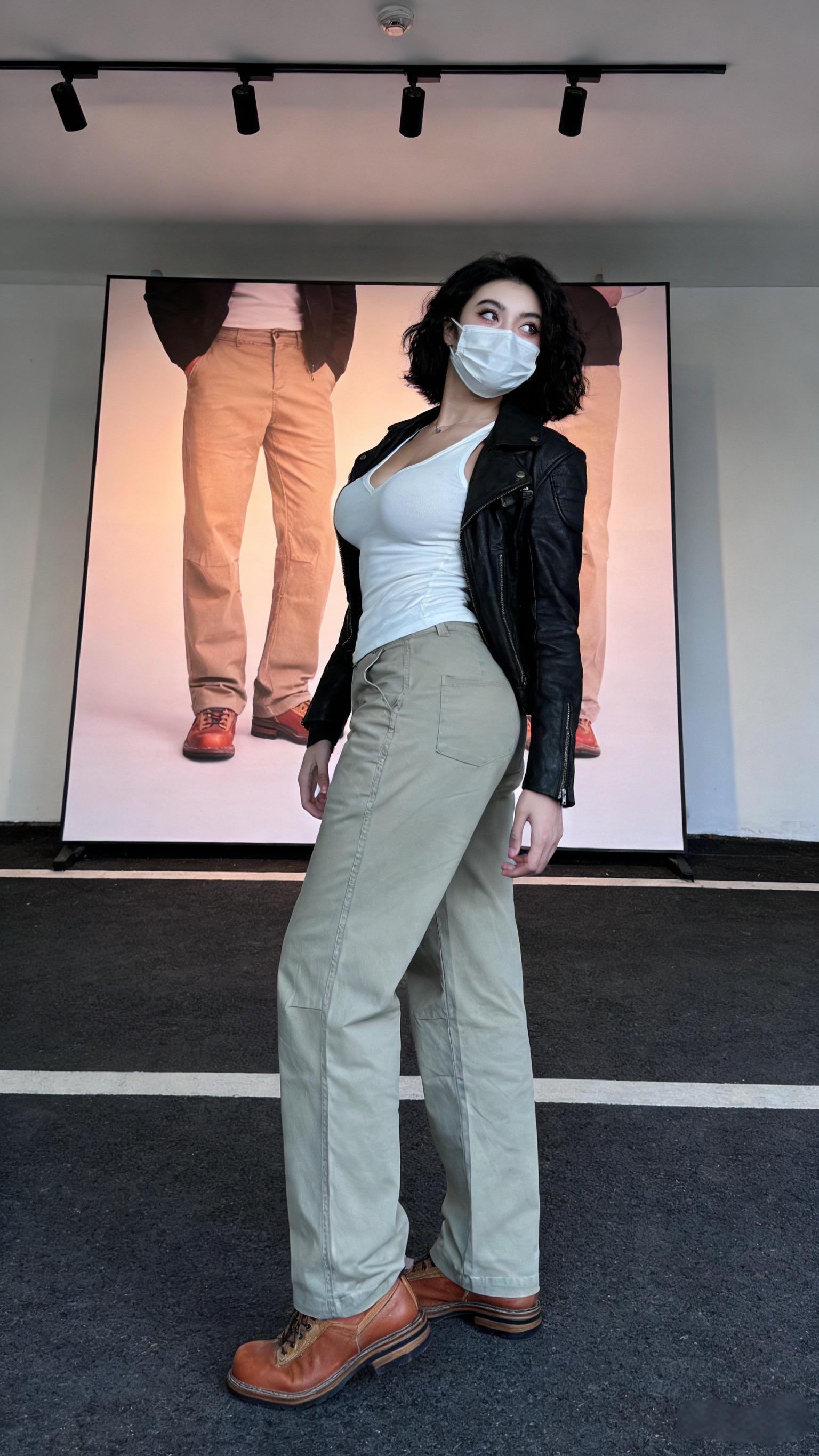 晒图笔记大赛东亚年轻女性,棕色长发,身穿米色短款皮夹克、白色内搭、牛仔短裤,背着