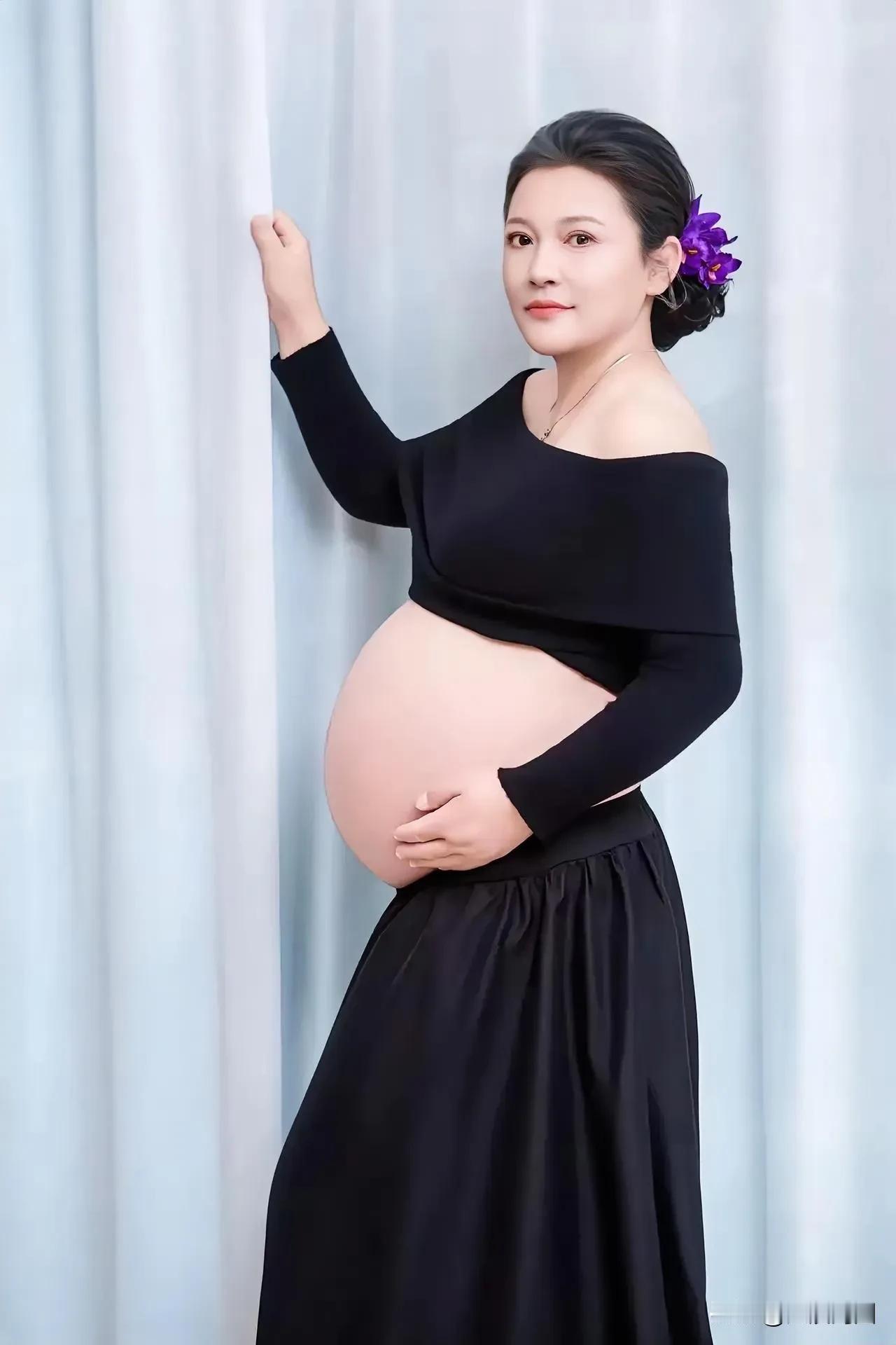 温柔孕味照,紫色花饰点缀,黑裙优雅显孕态。