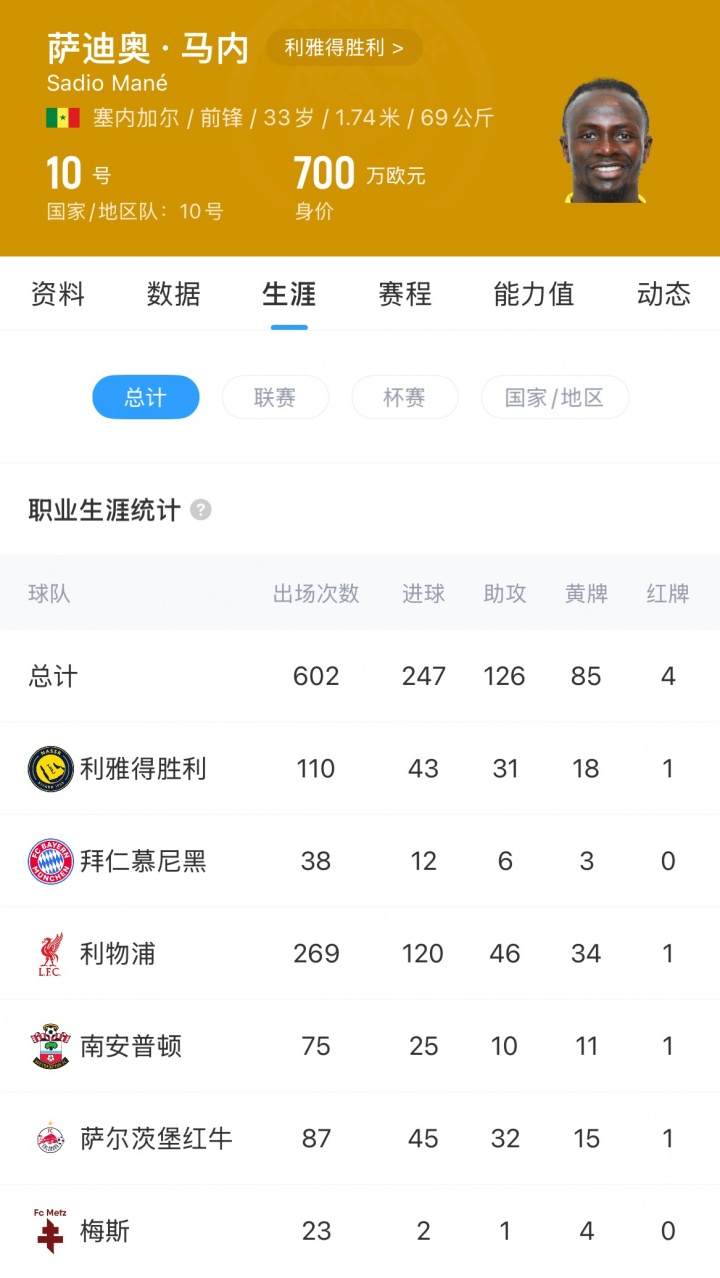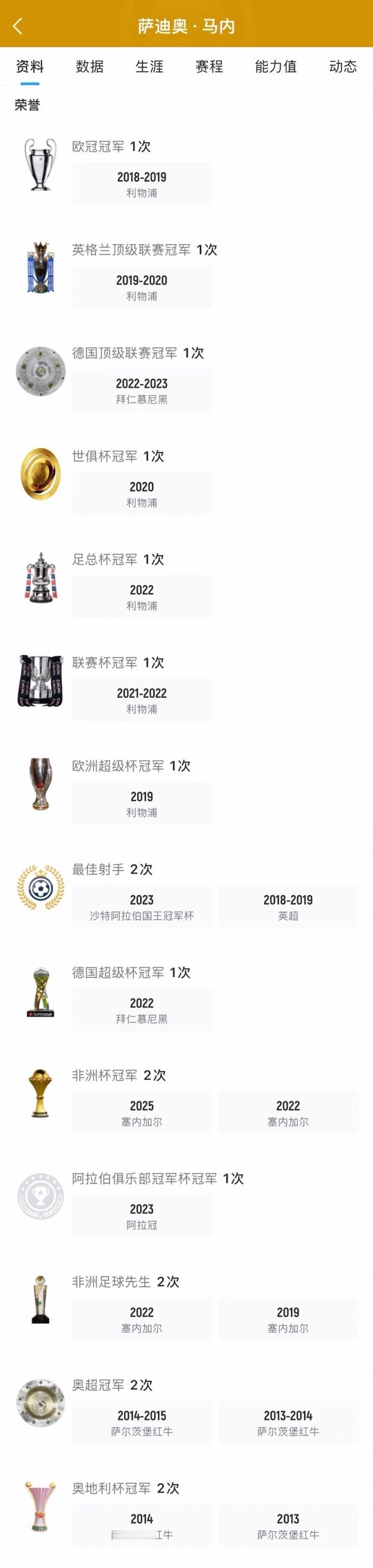 33岁的马内职业生涯至今已斩获多项冠军,其中最重要的当时两座非洲杯冠军、一座欧冠冠军、一座英超冠军、一座德甲冠军、一座世俱杯冠军以及一座足总杯冠军。