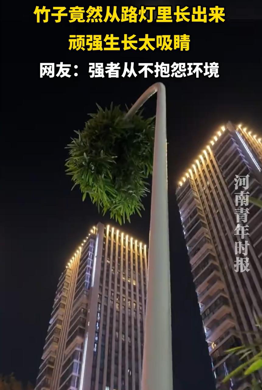这下解释不清了!浙江绍兴,一位男子出门遛娃,无意间撞见一件让人难以置信的事。路边一根普通的路灯杆,底下居然钻进去一棵竹子,更神奇的是,它竟然能在路灯里面一路生长,成为一根“路灯竹”,网友:突然明白什么叫做势如破竹 这竹子大概鸡蛋那么粗,从地面冒出来二三十厘米后,恰好遇到路灯杆根部一个破损的缺口。它就像认准了方向似的,一头钻进了灯杆内部 而且这根路灯杆有五六米高,在它的最顶端,原本该是灯泡的位置,竟然长出了一簇茂密的竹子枝叶,在空中随风摇晃,绿意盎然 路人经过都忍不住停下看看,有人拍照,有人讨论。一根金属灯杆,内部是封闭的,没有土壤,没有阳光,这竹子是怎么活下来的?又是怎么一路穿过整个灯杆,从顶端冒出来的? 网友们看到视频后也议论纷纷。有人说,突然就懂了什么叫势如破竹,原来现实里真有这样的事。有人感叹,不知道这棵竹子在里面熬过了多少个黑暗的夜晚,才终于见到天空。还有人说,这大概就是生命本身的力量,再艰难的环境,只要有一点可能,它就要找到出路 实际上,植物种子的萌发和生长,有时确实超出我们的日常想象。竹子的根系发达,竹鞭能在地下延伸,遇到缝隙就可能钻进去。路灯杆底部的破损口,可能正好成了它的入口 杆内虽然缺乏土壤,但可能积累了一些灰尘、雨水,甚至昆虫残骸,形成了些许养分。而竹子的生长方向天生具有趋光性,虽然杆内昏暗,但顶部的缝隙或许透进微量光线,引导它向上生长。 这根竹子活下来,更像是一场偶然的巧合。但恰恰是这种偶然,让我们看到了生命在极端条件下的另一种可能。它不需要太大空间,不需要肥沃土壤,甚至不需要完整的阳光,只要有一点点机会,它就会拼命向上生长 竹子穿透路灯生长 现已成网红打卡地