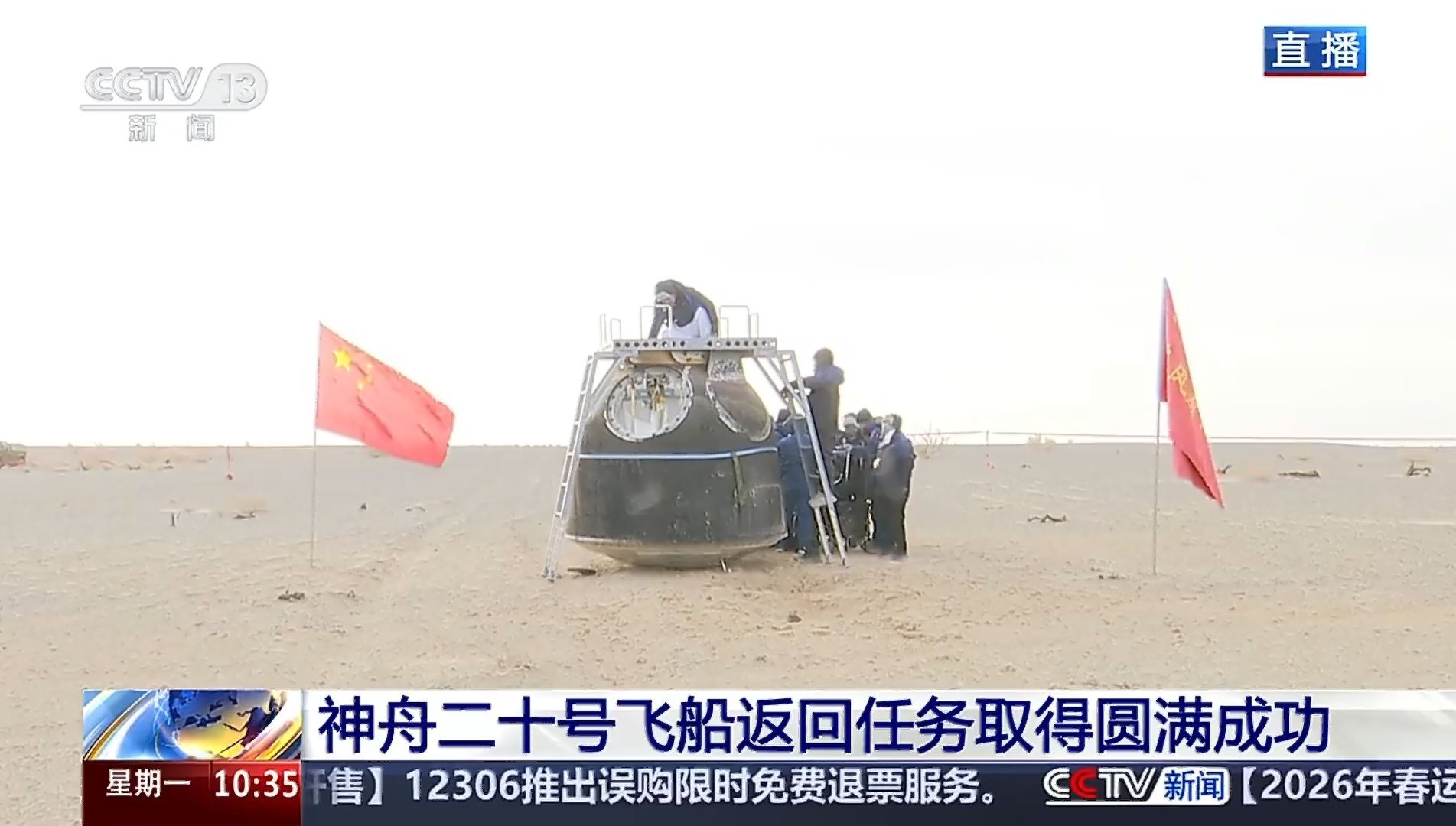 神20飞船返回东风着陆场 神舟二十号着陆后返回舱画面,还是直立状态