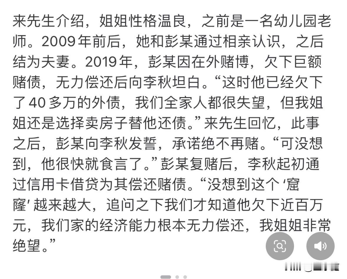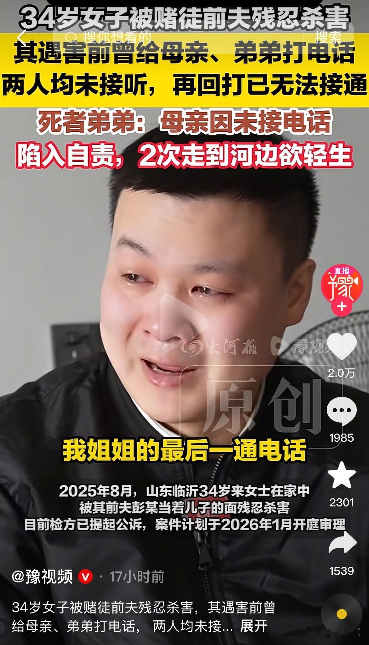 山东34岁女子被前夫杀害的当天,曾拨出去两通求救电话,她分别打给了母亲和弟弟,只可惜她们都没能及时接到。 看了案情背后的一些细节,心里真的非常压抑。怎么都想不通,对前夫如此仁至义尽的一个好女人,怎么就换来了如此结局呢? 来女士,时年34岁,她和彭某曾是夫妻。 二人因相亲而结识,之后也曾有过美好的爱情。 可走进婚姻后,来女士才发现彭某并非良人。他不仅好高骛远,不愿意好好过日子,还生性好赌。来女士为了家庭和孩子,一次次包容与原谅! 她吞下了所有委屈和泪水,卖房子替他还清了几十万后。可没多久,彭某又欠下了百万外债。 来女士只是一个普通的幼儿园老师,纵使她一天打几份工也无力承担那些债务,心灰意冷的她只能选择离婚! 离婚三年,她深知彭某日子很难,从没有跟他提过一分钱的抚养费,孩子的开销一直是她全力承担。 但彭某却因为她有了新的恋情,一直骚扰她,对她冷嘲热讽。 按道理来说,二人已经离婚多年,种种的一切都已经成为了过去式。来女士有了新的生活无可厚非,彭某应选择祝福她,但他做的事情却让人意想不到! 悲剧是2025年8月10日发生的!那时候正是孩子放暑假的时间,当天晚上,彭某借口上门看孩子,进到了来女士的家中。 来女士意识到情况不对后,一直向彭某求饶,请求他看在孩子那么小的份上,放过自己。 其次,她遇害前还找到了机会给母亲和弟弟打去了电话。可遗憾的是,母亲和弟弟都忙别的事去了。所以,那两通电话均没有被接通。等到他们回拨的时候,电话一边传来的只有无人接听的忙音了。 就此,他们一家人生死相隔,连最后告别的机会都没有! 直到现在,她的家人都非常自责。尤其是来女士的老母亲,压根没法接受这样的事实啊! 像彭某这样的男人真的是害人害己。来女士跟他在一起的时候,他不愿意珍惜,不愿好好过日子,由此,把对方的心伤透了。 来女士对他仁至义尽,没有丝毫亏欠,还一人独自抚养他们共同的孩子。但他却要了来女士的命啊,还让自己年仅11的儿子成为了孤儿! 如今,案子快要开庭了,来女士的家人终于等来了彭某被审判的一天! (信息源:豫视频)