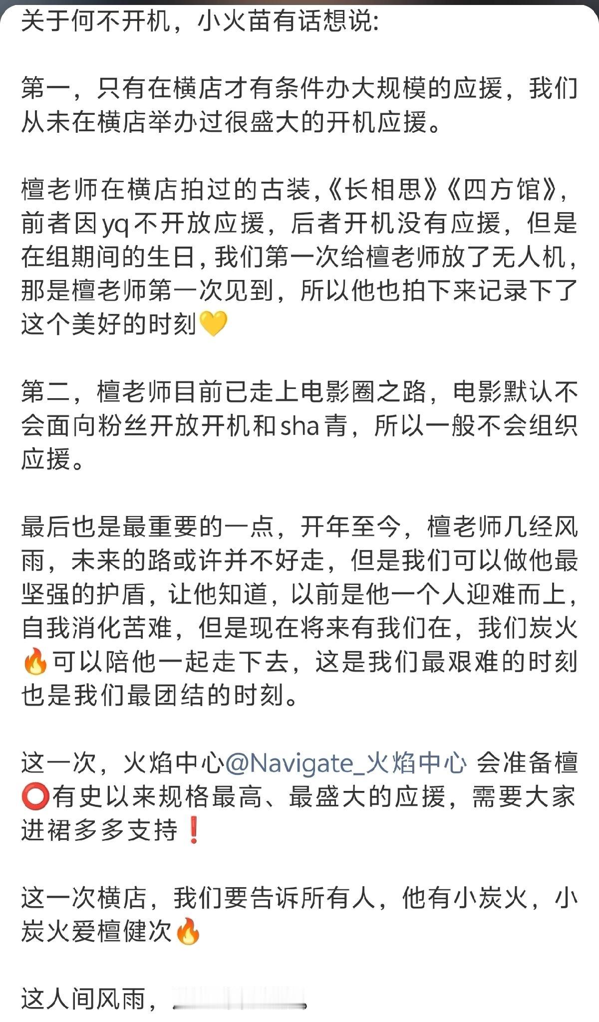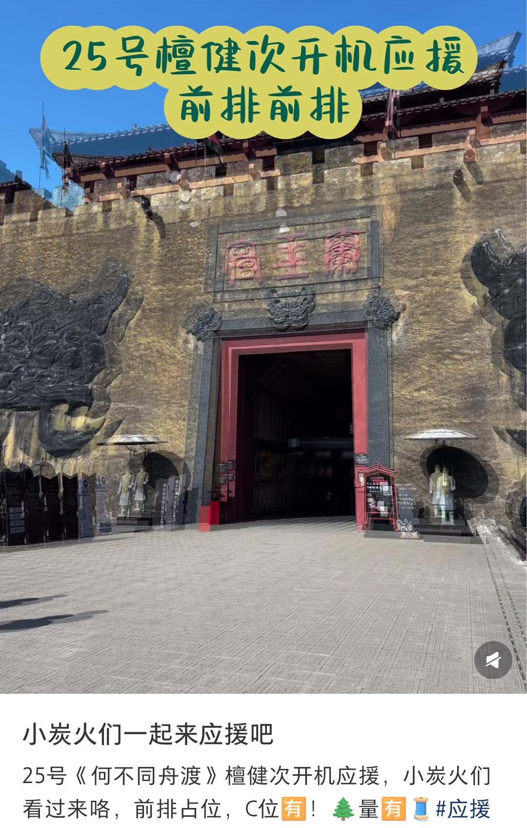 哇,这么早就有檀健次《何不同舟渡》的大屏了!谁能想到大哥上次开机应援竟然是23年的《滤镜》当时名额150人! 电视剧《四方馆》 23.10.21 杀青应援 无限制 电视剧《滤镜》 23.12.07 开机应援 150人(抽取) 24.03.25 杀青应援 500人 电视剧《猎罪图鉴2》无开机无应援 24.06.26 杀青应援 初始限制200人! 电影《震耳欲聋》檀健次,兰西雅 25.02.05 开机 非公开 25.04.03 杀青 非公开 电影《空枪》 25.11 无开机 26.01 无杀青或非公开 电视剧《何不同舟渡》 26.01.25 开机应援 无限制! 每一个工作人员镜头里他一直都举着手机拍,飞了多久他就拍了多久 从记录上来看,《滤镜》应该是檀健次目前为止所有的剧里面,开机杀青一切流程都最完整的一部剧,目前为止,没有一部剧,有这么完整的流程!也是檀老师所有剧里面,第一部做开机的剧!所以,我们的檀健次唐奇 真的是在一个充满爱和祝福里,长大的一个角色呀。 那一年《滤镜》杀青时的应援现场,大概是刻在小炭火记忆里的温柔瞬间吧。大哥拿着手机,镜头稳稳对着攒动的灯牌和一张张笑脸,像是想把所有相聚的片段都妥帖存进时光里。 檀老师这次好不容易回横店拍古装,下次再回横店都不知道猴年马月了,很少有开机能有这么大场地的。而且这次开机会搭台子,能照顾到后面的人也能看到,现场还搞了不少应援活动,内容非常丰富。 《何不同舟渡》这将是檀健次第一次大型的开机应援,以后不一定会有这种开机应援了,即使有也会限制人数,抽签,看超话等级啥的! 所以这次大家都非常珍惜这一次机会,好多小炭火跑步机都练起来了,都已经在疯狂锻炼体能了,准备杀出重围去看檀健次了! 终于要见识到了一个人带火一座城的场面了,《何不同舟渡》1月25日横店开机,小炭们已经迫不及待的定了2000多间房(还在持续增长中)准备去现场应援了。 千里为爱奔赴的含金量谁懂啊?据说24号晚上还会有无人机应援,想想这些壮观的场面就让人热血沸腾啊! 上次四方馆我们的无人机应援只有500台,每一个工作人员镜头里的大哥一直都举着手机在拍,无人机飞了多久他就拍了多久,这次我们的无人机有3200台!想想得有多震撼多壮观,所以我们的谢却山也绝对是在爱和祝福里长大的!