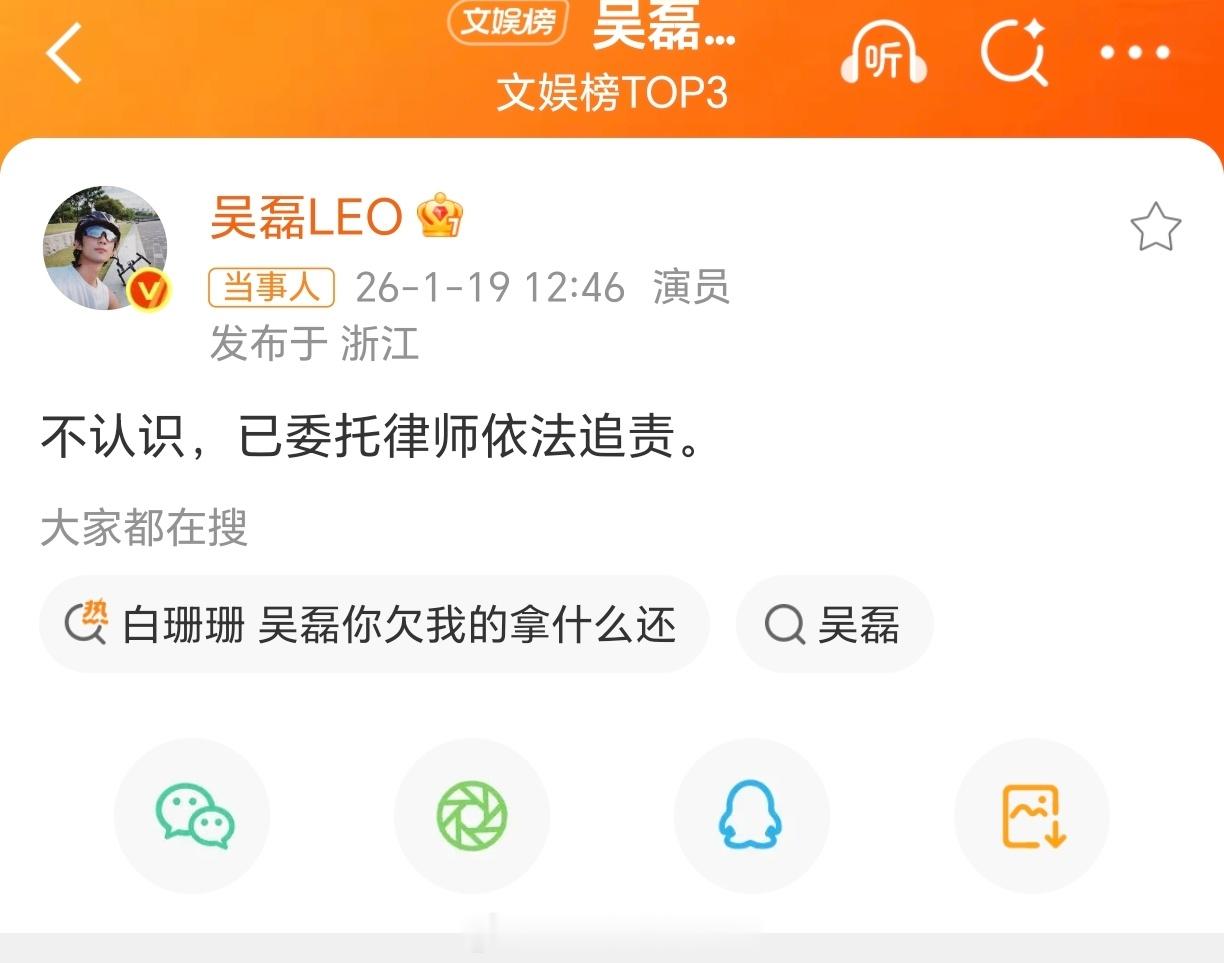 吴磊 不认识白珊珊艾特后,吴磊直接回应了:不认识,已委托律师依法追责。感觉这波吴磊wwzz,那个女的建的群进去就让人给她打10000