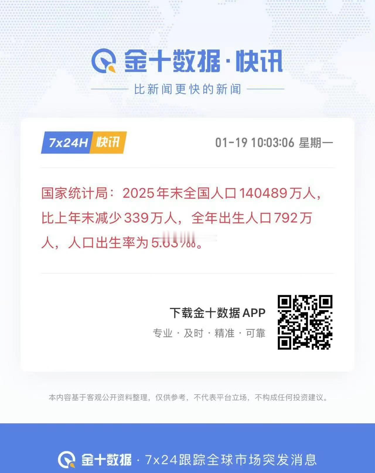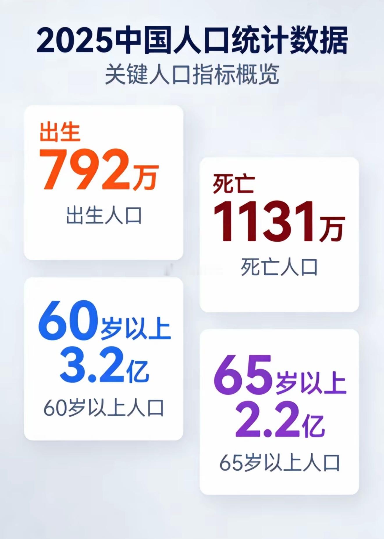 国家统计局:2025年末全国人口140489万人,比上年末减少339万人,全年出生人口792万人,人口出生率为5.63‰