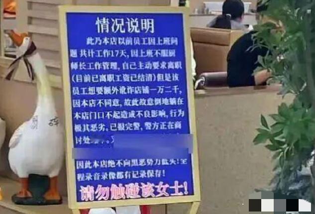河南一女子躺人家店门口,头部用帽子盖住,整整赖了4天趴地不起。店家没辙,在女子旁边树立一个牌子,说明了情况:女子是本店员工,自行离职,但是如今又过来讹诈1万2千元,不给就耍赖。很多部门人员过来沟通,但是女子也不起身、也不说话,遇到这样的无赖,可该怎么办? ” 事情得从十几天前说起,这家餐馆招了位50来岁的大姐做面点师,大姐刚上班那阵挺勤快,要求10点到岗,她九点多就会到店,原本相处得还算融洽。 可没想到上班第17天,因为一位顾客投诉饼的味道不对,厨师长检查后发现是面粉发酵过度。 跟大姐沟通时语气有点冲,还说了句“不干就滚”,这话一下子点燃了矛盾,大姐当场就表示辞职,转身就走了。 店家当晚就通过转账结清了她17天的工资,本以为这事就到此为止,没成想几天后,大姐突然出现在餐馆门口。 她既不吵也不闹,直接往地上一趴,把连帽衫的帽子往头上一盖,就那么一动不动地赖着。 这一趴就是整整四天,白天餐馆开门营业,她就趴在门口,晚上餐馆打烊,她也不离开,由商场物业帮忙照看,累了还会到旁边的休闲长椅上歇会儿,无聊的时候就趴在地上听番茄小说。 餐馆的生意可就遭了殃,原本的客流少了大半,营业额直接砍了一半,顾客们看到门口趴着个人,都纷纷绕道走,没人敢进店消费。 店家实在没辙,又怕不明真相的顾客误会,只好在大姐旁边立了块牌子。 把前因后果写得明明白白:这位女子是本店前员工,自行离职后工资已结清,如今索要1.2万元赔偿金被拒,便采取此种方式纠缠,还特意用红色大字标注“请勿触碰该女士”。 商场管理人员来了,耐心劝说半天,大姐不为所动。 相关部门的工作人员也多次上门沟通调解,可她始终一言不发,就是不起身,店家前后报警七八次,也没能彻底解决问题。 更有意思的是,这事儿在网上传开后,还有网友特意跑到店门口跟趴着的大姐合影,戏称这里成了“新打卡点”。 不过店家很快就用了个巧妙的办法化解尴尬,他们本来就有大鹅作为店铺吉祥物,索性买了一只毛绒大鹅玩具放在门口,代替了之前大姐趴的位置。 憨态可掬的大鹅一下子吸引了不少路人驻足拍照,甚至有人因为这只大鹅进店消费,让店家意外“因祸得福”。 截至1月14日,有记者联系店家得知,大姐已经被警方带走,双方正在协商处理,后续大姐没再出现在店门口。 这场持续四天的僵局总算有了转机,可网友们的讨论还没停,大家都在琢磨,遇到这种既不违法又明显不合情理的纠缠,店家到底该怎么维护自己的权益。
