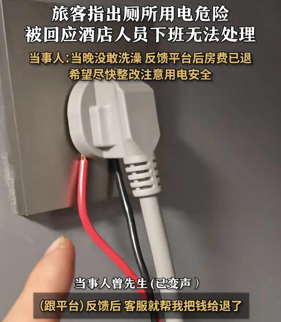 贵州六盘水一位旅客入住酒店,当天晚上准备洗澡的时候,发现厕所里面的电路设施非常的危险,零线火线外露,插座没有保护,而且是联通智能厕所的,于是打电话给酒店工作人员,但是被告知工作人员已经下班了,无法处理这样的事情。还跟旅客说放心使用,但是游客看到这种情形,真的不敢去洗澡,跟平台反映,平台已经退还房费,并督促尽快整改。旅客真的无法相信,现在还有旅馆用这样的方式取电的。