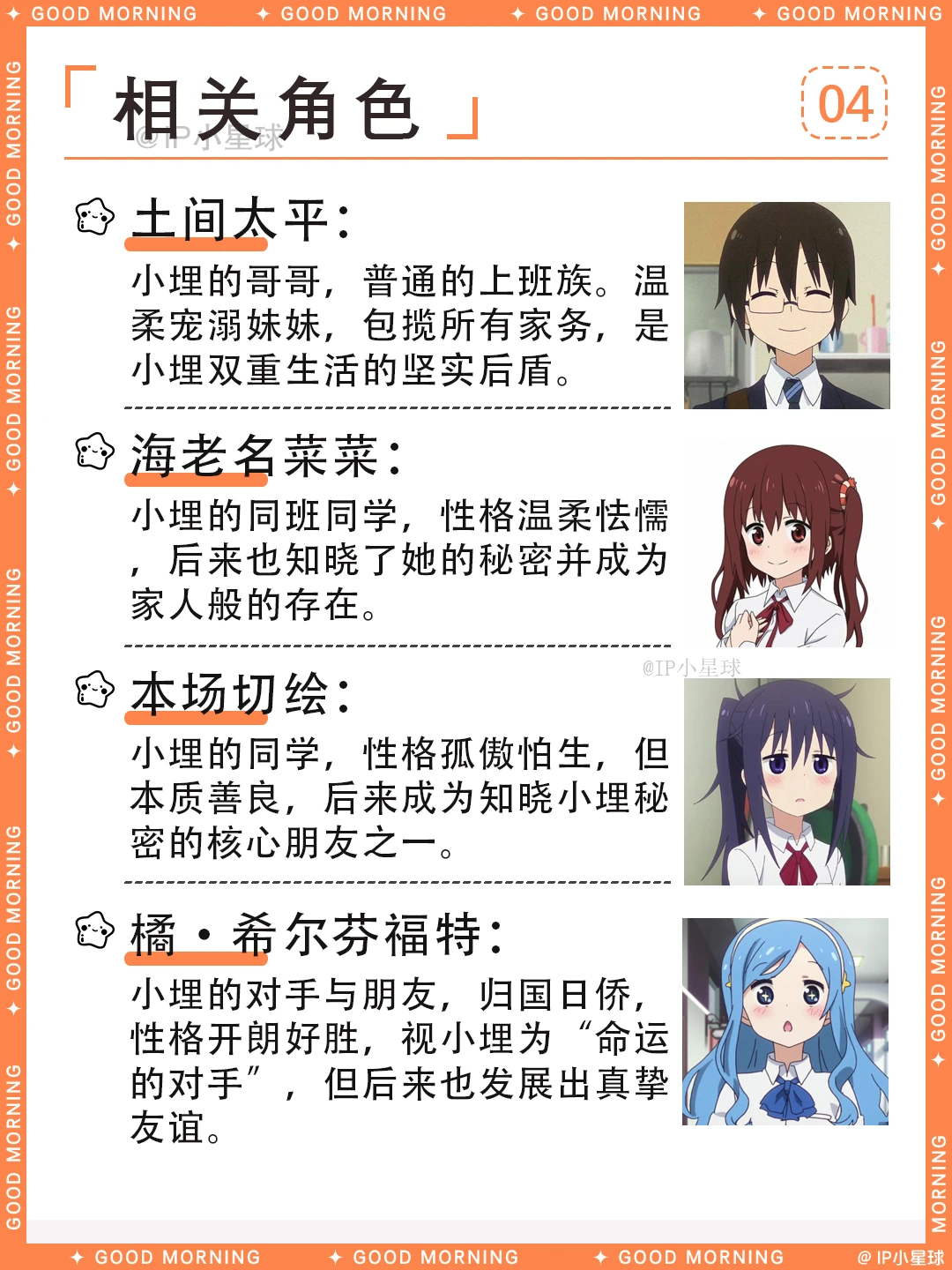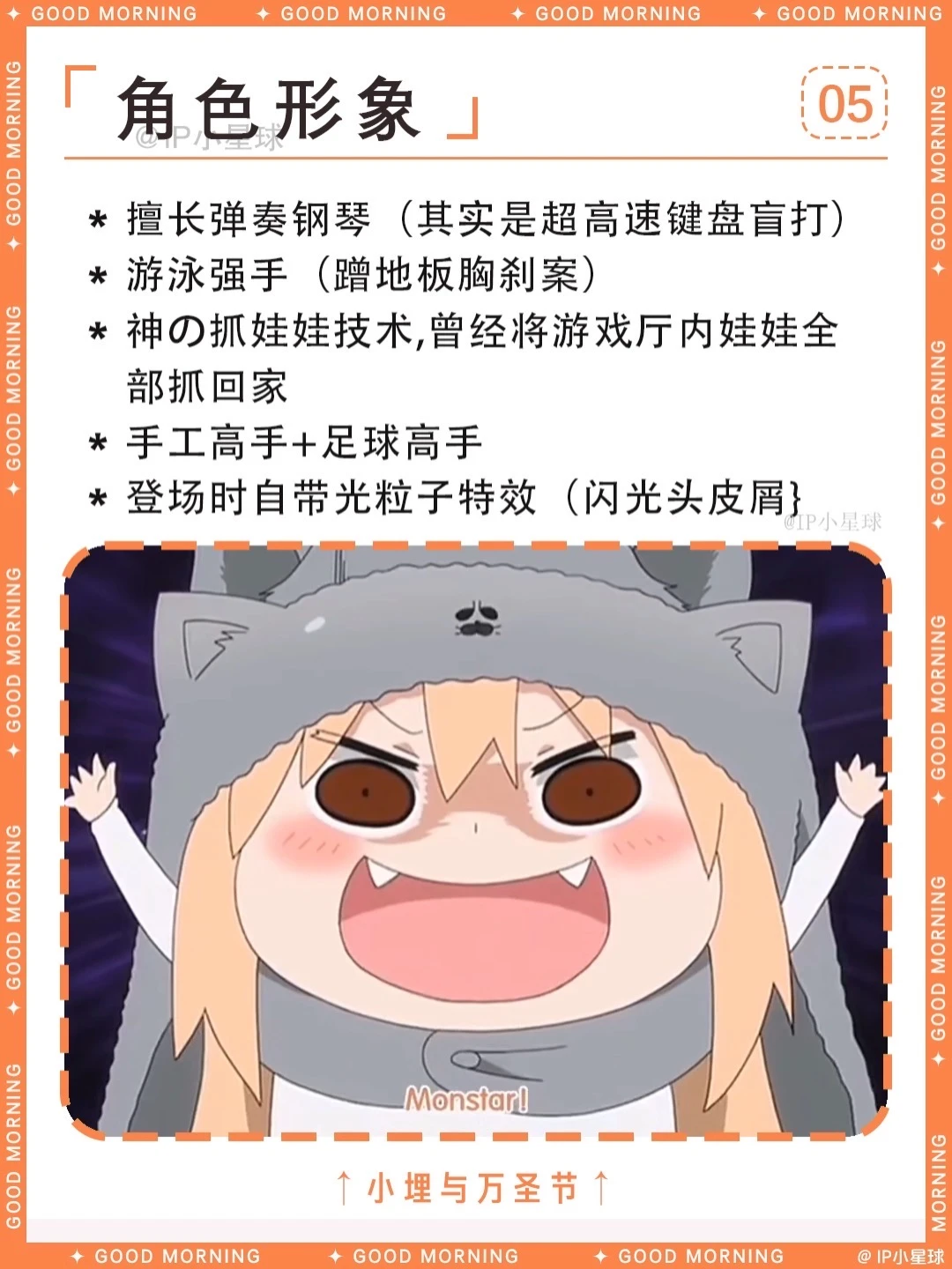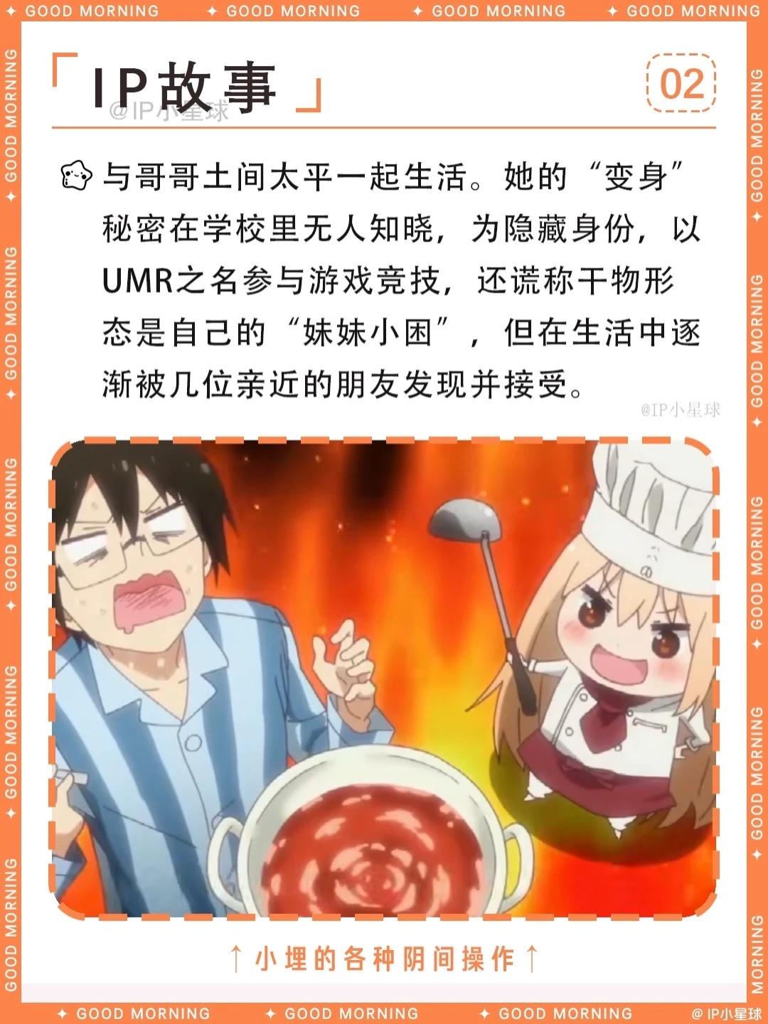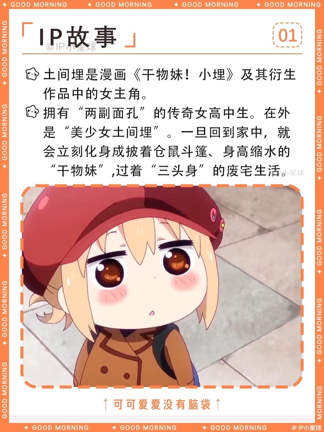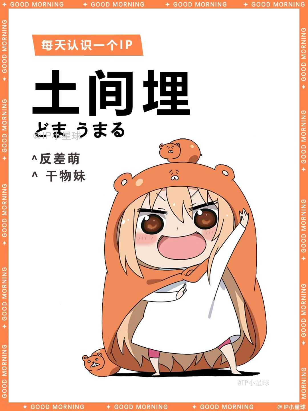 这绝对是二次元最离谱的“双面娇娃”——土间埋! 白天是校园女神,晚上秒变40cm仓鼠精,可乐配薯片,游戏打到天亮!哥哥太平一边当保姆一边吐槽:“这妹妹还能要吗?”最绝的是她的“UMR”马甲,在游戏厅横扫排行榜,橘大小姐气得直跺脚~ 这样的反差萌小埋谁能不爱?快来一起围观小埋的“精分”日常,解锁宅家最高幸福形态! ----------关于土间埋---------- 中文名:土间埋 外文名:どま うまる / Doma Umaru 别 名:小埋,干物妹,UMR 性 别:女 生 日:9月26日 星 座:天秤座 年 龄:16岁 血 型:AB型 地 区:十一区 团 体:荒矢田高中 身 高:160cm(在外)40cm(在家) 三 围:84/56/78 cm(人前) 爱 好:玩游戏,看动漫 身 份:游戏高手UMR,完美的女高中生 喜欢的食物:可乐、方便面、薯片 讨厌的食物:青椒 📢整理不易,欢迎补充~ 🚀想先睹为快哪个IP? 快来评论区留下你的期待!📬