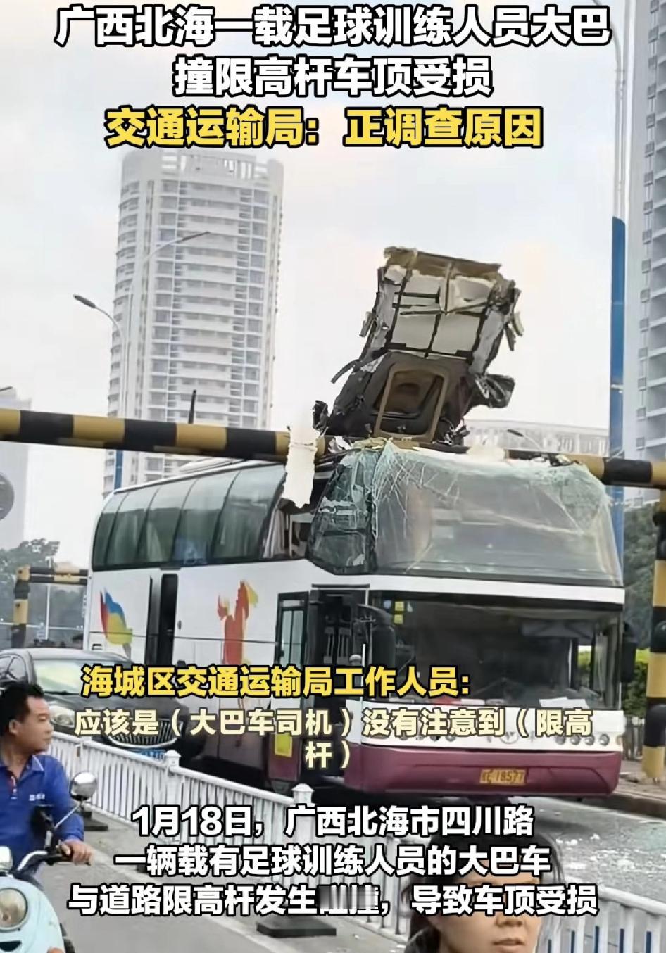 广西北海一辆载有不少足球训练人员的大巴撞到了限高杆,导致车辆受损。有交警部门回应,应该是大巴司机开车的时候并没有注意到前面的限高杆,所以导致了事故的发生。大巴已脱离了现场,车上的人员也没有受伤。