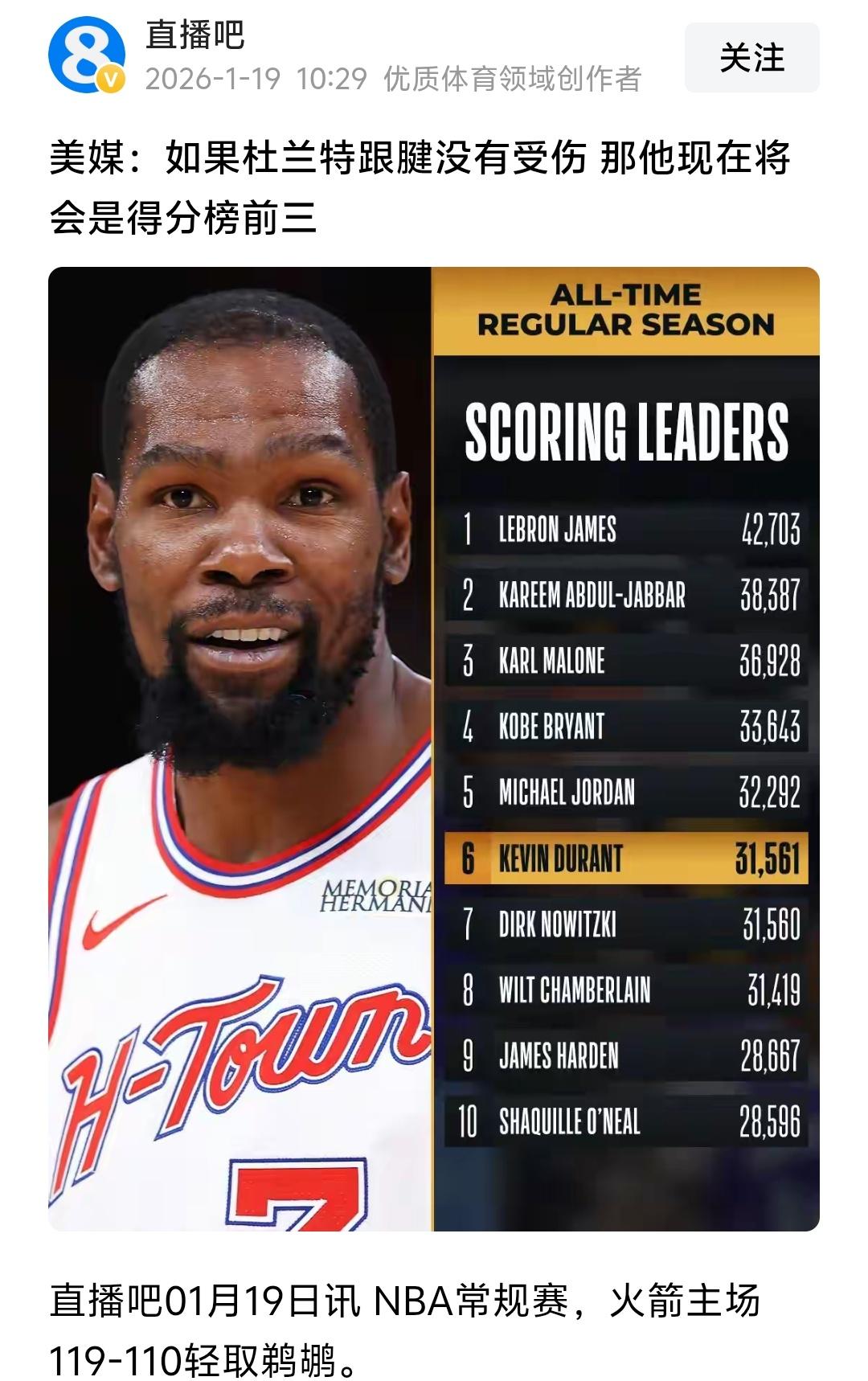 杜兰特退役时得分很有可能会超越卡尔马龙进入前三,而詹姆斯能否在退役前拿到45000分,这个就很难说了!