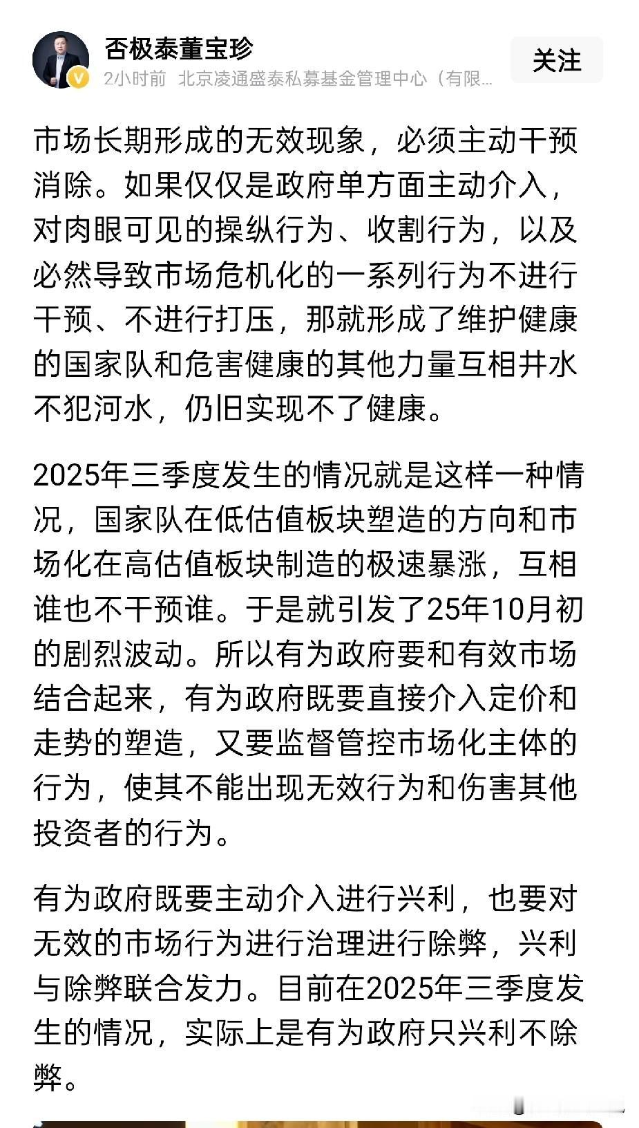 说实话,在金融行业内,据我所知所见所闻,没有任何一个有一定职级和市场影响力的从业人员认为当下的市场不理性不健康,他董宝珍是唯一一个。 而这一切只是因为他自己持有的银行股不涨,便像一个怨妇一样,天天抱怨市场,抱怨监管,抱怨制度。这样的机构推出的产品,谁买谁倒霉。 目前业内普遍的共识,都认为当下是一轮比较健康合理的慢牛,结构牛。