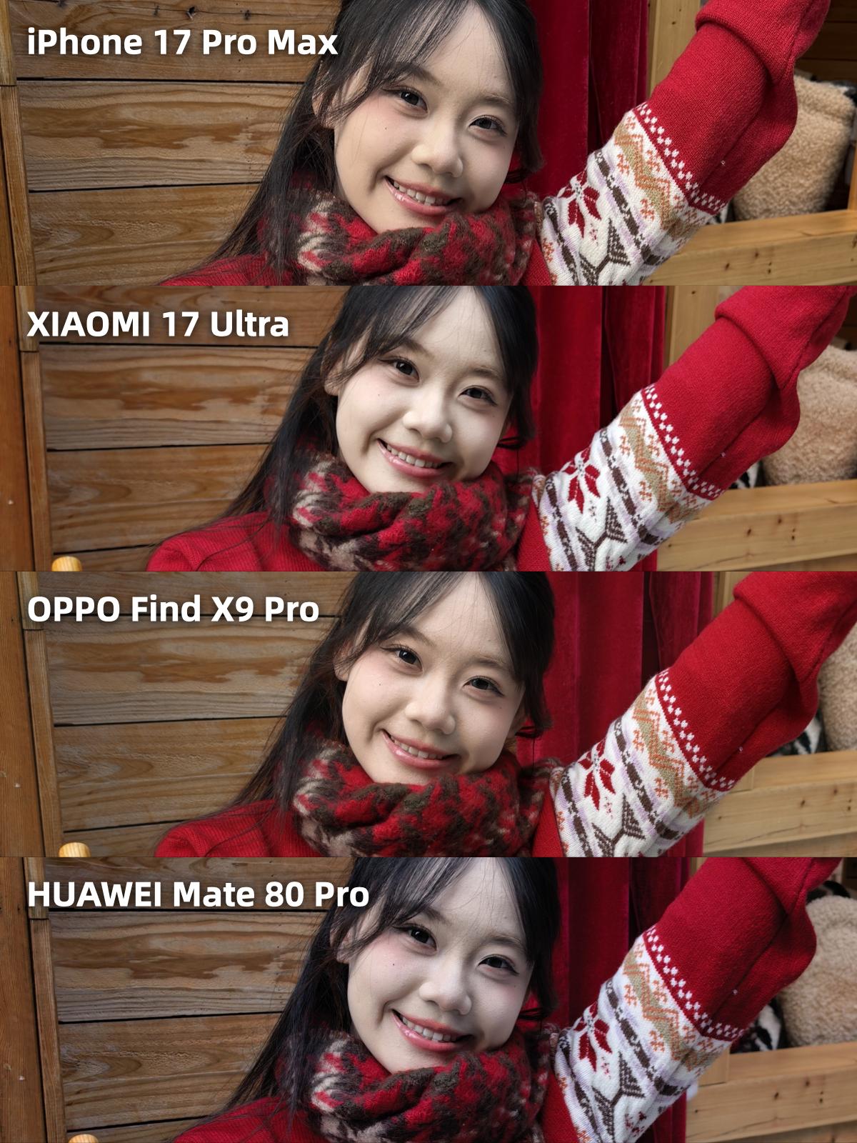 年前换拍照手机🎆选哪台C位更出片? 还有不到一个月就到春节,每年这时候拍照需求直接拉满:年夜饭、全家福、同学聚会,谁不想把人拍好看点。 为了研究哪一款旗舰拍人像比较好看,我找来了iPhone17 Pro Max、OPPO Find X9 Pro、华为Mate80 Pro、小米17 Ultra四款机型,直接实拍了一波,供大家做一个参考👇。 📱 iPhone 17 Pro Max 虽然用上了4800万像素镜头,清晰度没啥可挑剔的了,但实话说,拍人像很吃光线,光线不足的时候,肤色容易偏黄暗沉,大多时候都要后期精修才能发⭕️。 📱 小米17 Ultra 一英寸大底真的不是盖的,画质扎实。徕卡调色很有“德味”,高对比度让照片很有故事感。但它的人像美颜磨皮给的比较多,属于第一眼讨喜那种。 📱 华为Mate80 Pro 色彩很真实,第二代红枫色彩镜头确实厉害,人像不会发红发黄,脸颊自带温润光泽感~ 📱 OPPO Find X9 Pro OPPO的调校,是手机拍照界老炮了,人像拍出来妆容细节刻画得非常细腻,有气血感,不假白也不灰,丹霞色彩还原镜头+人像调校真的很对女生胃口。再加上它的7500mAh电池是几款机型蕞大的,过年拍一天也不慌。 综合看下来,华为和OPPO都配备有色彩镜头,在拍人像的时候确实更有优势,肤色还原非常精准。关键是现在OPPO Find X9 Pro价格也很香,直减500+限定礼盒三选一+24期免xi,感觉会更香一点,选的人会更多吧? 有没有用过的来分享下体验感受🙏 新年换新机 手机推荐 iPhone17Pro OPPOFindX9Pro 华为Mate80Pro 小米17Ultra 人像摄影 国补 哈苏人像