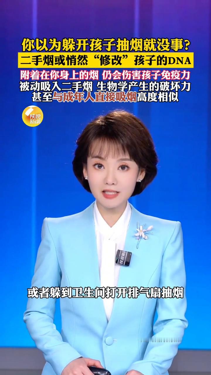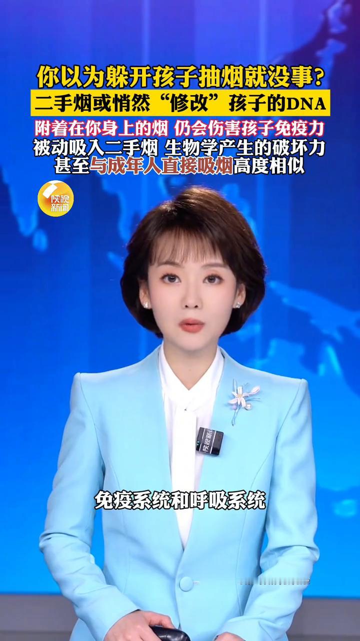 你以为躲开孩子抽烟就没事?二手烟或悄然"修改"孩子的DNA,附着在你身上的烟仍会伤害孩子免疫力。 陕视新闻主播李昱霏。 不当着孩子的面偷偷跑到阳台或者躲到卫生间打开排气扇抽烟就真的没事了吗?家庭二手烟可能会修改孩子的DNA。据科普中国发文称,科学家发现了11个会随着二手烟暴露而发生改变的基因开关位置。孩子被动吸入的二手烟在生物学层面上产生的破坏力甚至与成年人直接吸烟高度相似。 二手烟攻击的恰恰是孩子最需要保护的免疫系统和呼吸系统。二手烟可能直接削弱了孩子肺部识别和抵御病原体的能力。不要再觉得出去抽根烟回来对孩子就是安全的,附着在衣服上的微粒依然被孩子吸入。不要觉得"孩子大了,抵抗力强了"就无所谓,他们的基因依然在被环境塑造着。请给孩子一个真正无烟的童年。