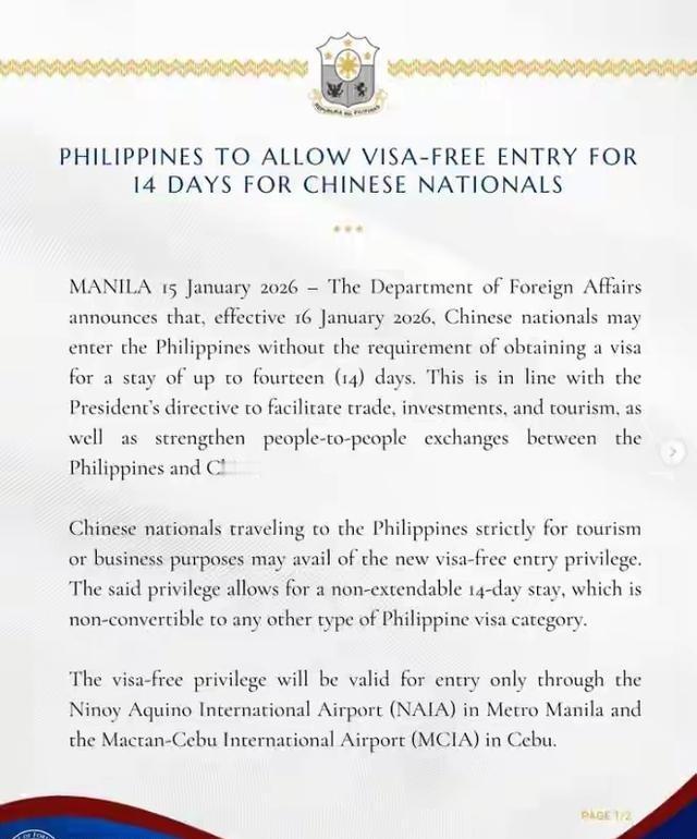 太阳从西边出了?1月15菲律宾外交部宣布,自1月16日起,菲律宾将对中国公民开启免签政策,最长可停留14天。以前菲律宾旅游业颇为依赖中国游客,2019年,约174万中国游客远赴菲律宾游玩,在该国客源国中,中国仅次于韩国,为第二大“金主”,彰显出中国游客对其旅游产业的重要意义。 这事听起来挺新鲜的,菲律宾突然对中国游客免签了,感觉就像太阳打西边冒头一样。想想看,之前去趟菲律宾还得折腾签证,材料一大堆,现在说免就免了,虽然只限14天,但对想短期溜达的人来说,确实省事儿。菲律宾旅游这块儿,早几年特别火爆,尤其是中国游客贡献不小。 回想2019年,那时候中国去的人多达174万,仅次于韩国人,稳坐第二大客源国的位置。这些游客不光是去晒太阳,还带去了真金白银,拉动当地经济。海滩酒店、潜水项目、街头小吃,全靠这些外来消费撑着场子。旅游业在菲律宾GDP里占了13%的份额,四成左右的就业岗位都跟这行挂钩。要是游客少了,饭碗就晃荡了。 可好景不长,疫情一来,一切都变了。人们出门谨慎了,不敢轻易跨国界。菲律宾的签证政策也老是变卦,一会儿电子签容易办,一会儿又卡材料,审核严得像过筛子。结果呢,到2025年前八个月,中国游客只剩18万,掉了九成多。这数字一对比,就知道问题大了。酒店空房率高,潜水教练没事干,水果摊的榴莲堆着卖不动。整个产业链都蔫了,经济自然跟着遭殃。菲律宾政府一看不行,得想招儿拉人回来。这免签政策,就跟打了一针兴奋剂似的,针对中国市场下手,盼着游客回流。 1月15日,外交部正式放话,从第二天起,中国护照持有者就能免签进去了,停留最多14天。这消息一出,估计不少人开始盘算行程了。政策主要针对旅游和商务,入境口岸只限马尼拉和宿雾两个机场,其他地方不行。为什么这么设限?菲律宾那边担心人太多管不过来,还怕有人借旅游干别的,比如非法打工啥的。所以,这免签是有限度的,既想赚游客的钱,又不想多担风险。申请者得满足几个条件:护照有效期要在停留后至少剩半年;得提前订好酒店,把订单打印出来带着;还必须有返程或者转机的机票,证明不会赖着不走。这些门槛一摆,等于告诉大家,别以为免签就随便玩儿,得准备齐全了再来。 其实,这政策背后是菲律宾的自救举措。旅游业下滑太狠,GDP贡献那么大,不能就这么凉凉。之前中国游客是主力军,他们的消费力强,爱去热门岛屿如长滩岛和薄荷岛,花钱不手软。可疫情后,大家选择多了,东南亚其他国家签证也简便,菲律宾就落后了。这次免签,算是个补救,试着抢回市场份额。航空公司这边,机票价格没怎么动,从上海直飞马尼拉还是一千块左右,中转的更便宜,八百就能搞定。但酒店就精明了,春节期间热门地方房价已经悄悄涨了20%。这也正常,需求一上来,商家总得赚点。 对中国游客来说,这变化挺实惠的。不用再跑使馆排队,填表等审批,时间和钱都省了。尤其是那些想周末飞去度假的,或者商务考察的,吸引力大增。短途旅行本来就图个方便,现在门槛低了,估计会带动一波小高峰。菲律宾的景点资源丰富,海岛风光一流,潜水天堂,文化混搭中西,够玩的。但话说回来,政策好归好,实际落地还得看执行。机场检查会不会太严?配套服务跟不跟得上?这些都是问题。 这免签只给一年试水期,到时候看效果再决定续不续。菲律宾得抓住机会,改善点东西。比如治安,有些地方过去报道过抢劫和骗局,游客遇上就倒霉了。如果不加强管理,事故一多,大家肯定绕道走。还有交通、导游这些,得升级服务,别让游客觉得体验差。酒店涨价可以,但质量得对得起钱。航空线路也得多开点,方便不同城市出发的人。 总的来说,这政策是双赢潜力大,对菲律宾是拉动经济,对中国游客是多选项。但要长久,得解决根儿上的毛病,不能光靠免签这噱头。游客要的不只是进门容易,更得玩得安心。菲律宾要是真下功夫,治安稳了,服务好了,说不定能重回中国游客的热门榜。要是还老样子,游客来一趟走一趟,下次就不来了。免签是起点,不是万能药,得配上实际行动才行。