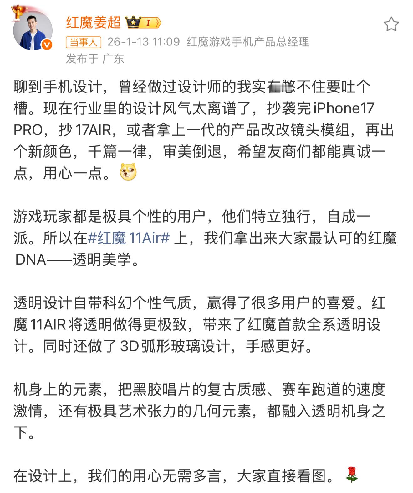 手机外观设计同质化确实严重,红魔敢于站出来吐槽,不如就吐槽的再猛一些hhh正好给20号红魔 11Air发布会预热一下不过就事论事,红魔在外观方面设计确实很独立独行,透明美学的质感还是很能打的,对追求个性的玩家们来说很对味儿