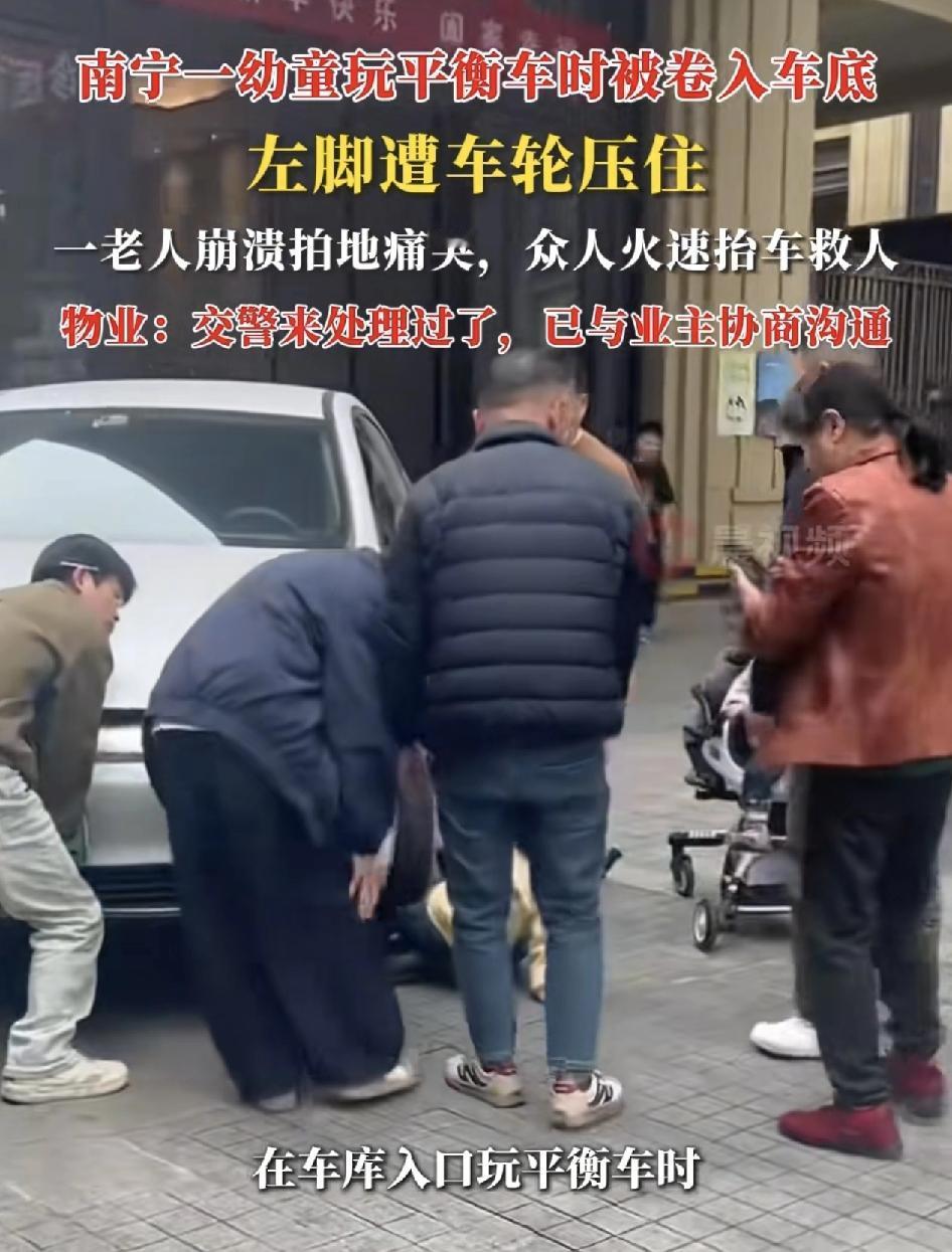 南宁一小区停车场门口一名男童在玩平衡车时不慎被一辆小车底,左脚被小车车轮压住。周边的群众看到之后,合力抬起小车把男童救出,旁边的老人一直在痛哭,男童也迅速被送往医院救治。不过像停车场入口出口,小孩子在周边玩,家长必须要负责任,小车司机也很无辜,毕竟在这样的出入口视角也有盲区,车速也一下子难以控制。
