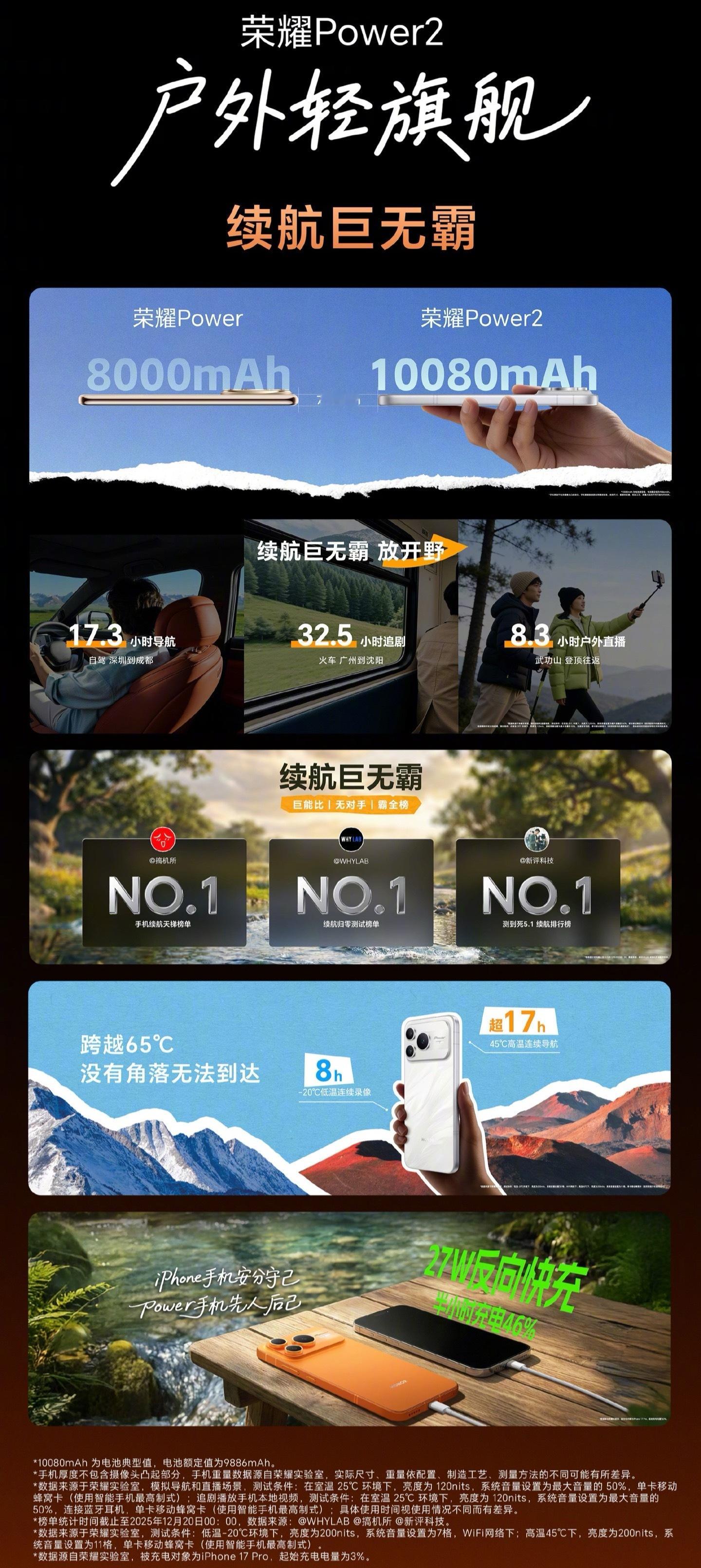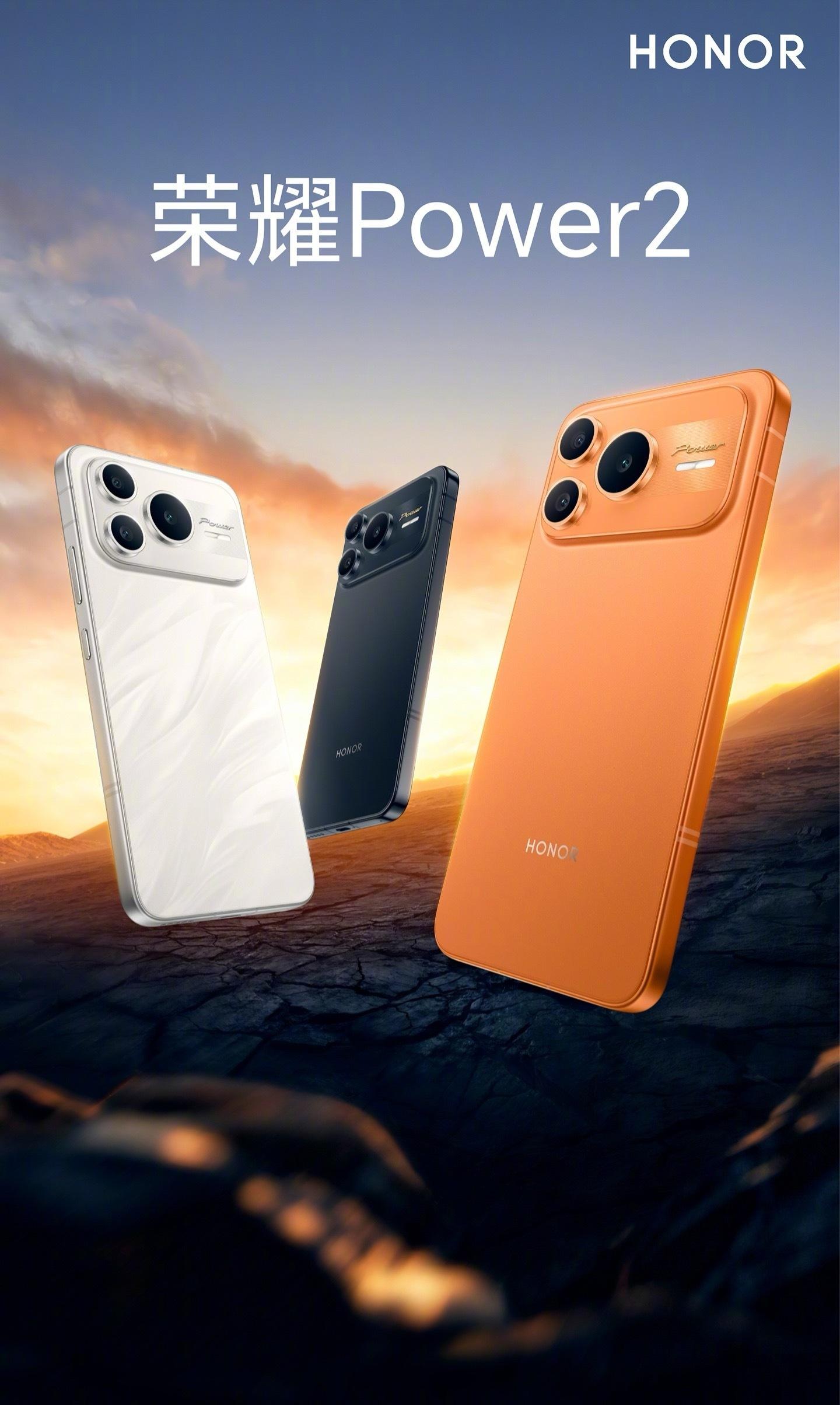 荣耀 Power2 配备精研雾面金属中框,采用一体化冷雕工艺设计,提供旭日橙、雪原白、幻夜黑等配色,新机集齐 IP68、IP69、IP69K 满级防尘防水。新机将搭载 10080mAh 的第四代青海湖电池,还支持 80W 超级快充 +27W 反向充电,变身“充电宝”,机身厚度 7.98mm 与上代相比保持不变。荣耀 Power2 采用独特 Power 信号岛设计,搭载自研射频增强芯片 C1+,以及首创平行双轨天线设计,实现弱网信号增强 200%,四网频段全面领先。此外,新机行业首发天玑 8500 Elite 芯片,安兔兔综合跑分超 240 万,档位第一。此外,新机还提供全场景 NFC、红外遥控等功能,配备 6.79 英寸 8000nits 超亮荣耀绿洲护眼屏。数码好物种草计划