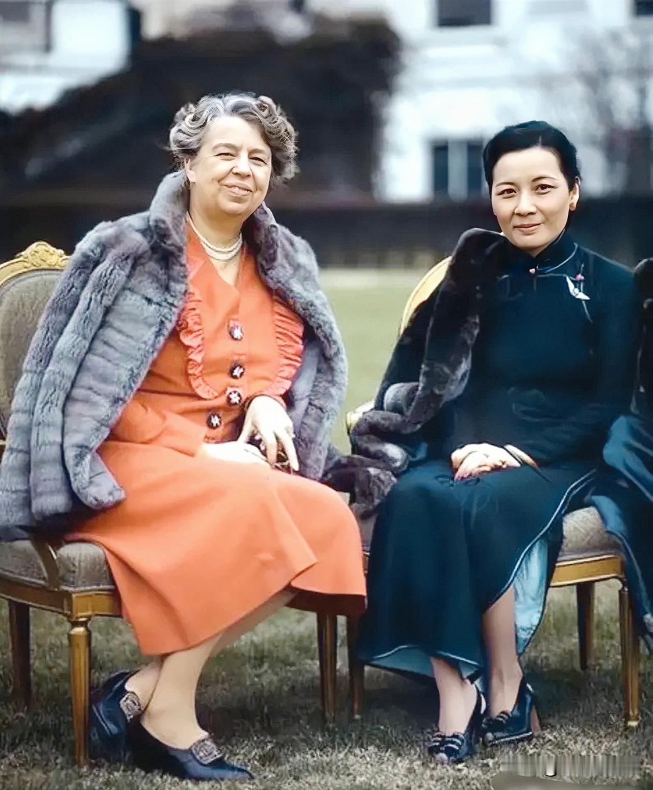一九四三年,出访美国时与罗斯福夫人一同合影的宋美龄,时年四十六岁。