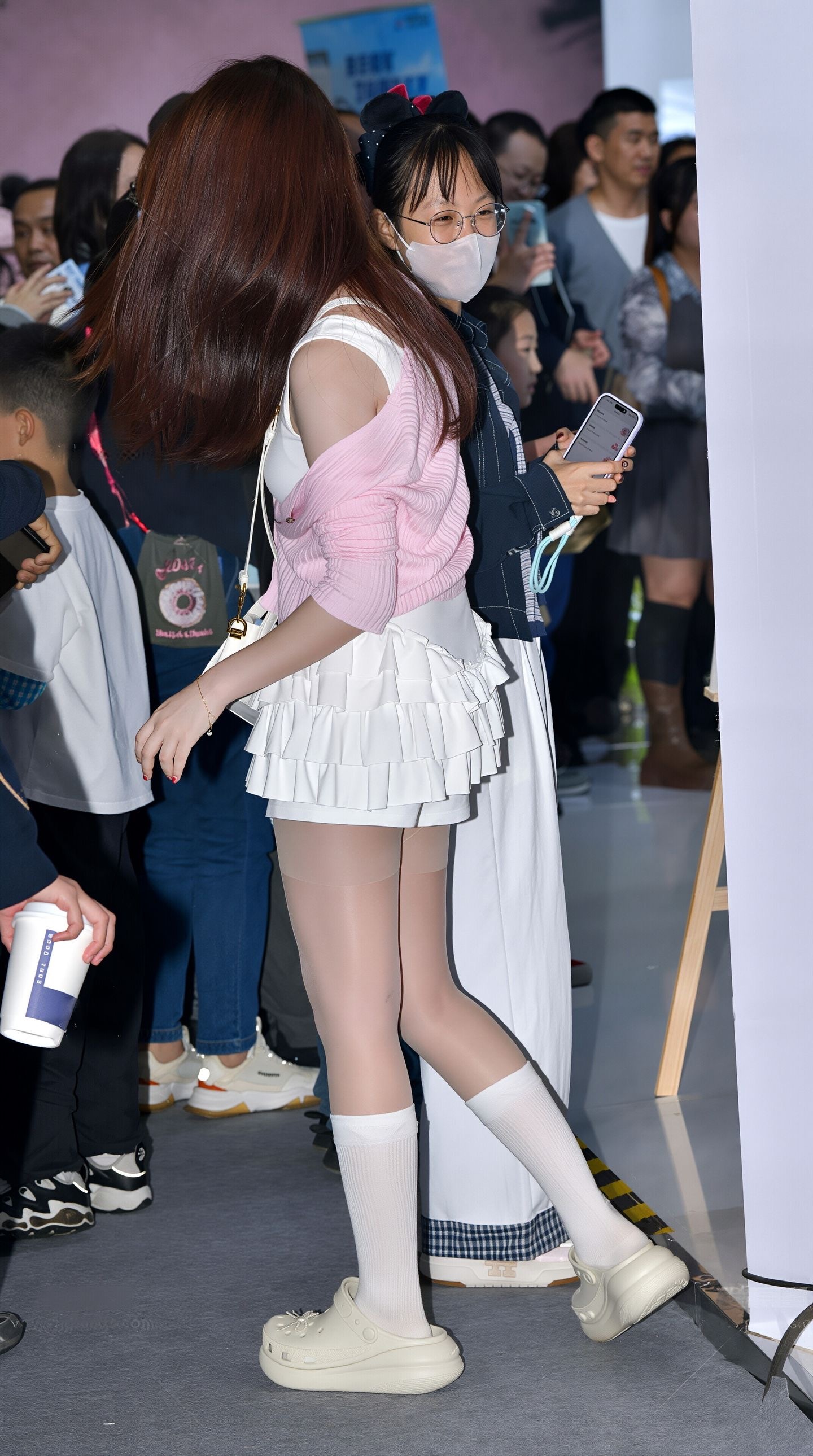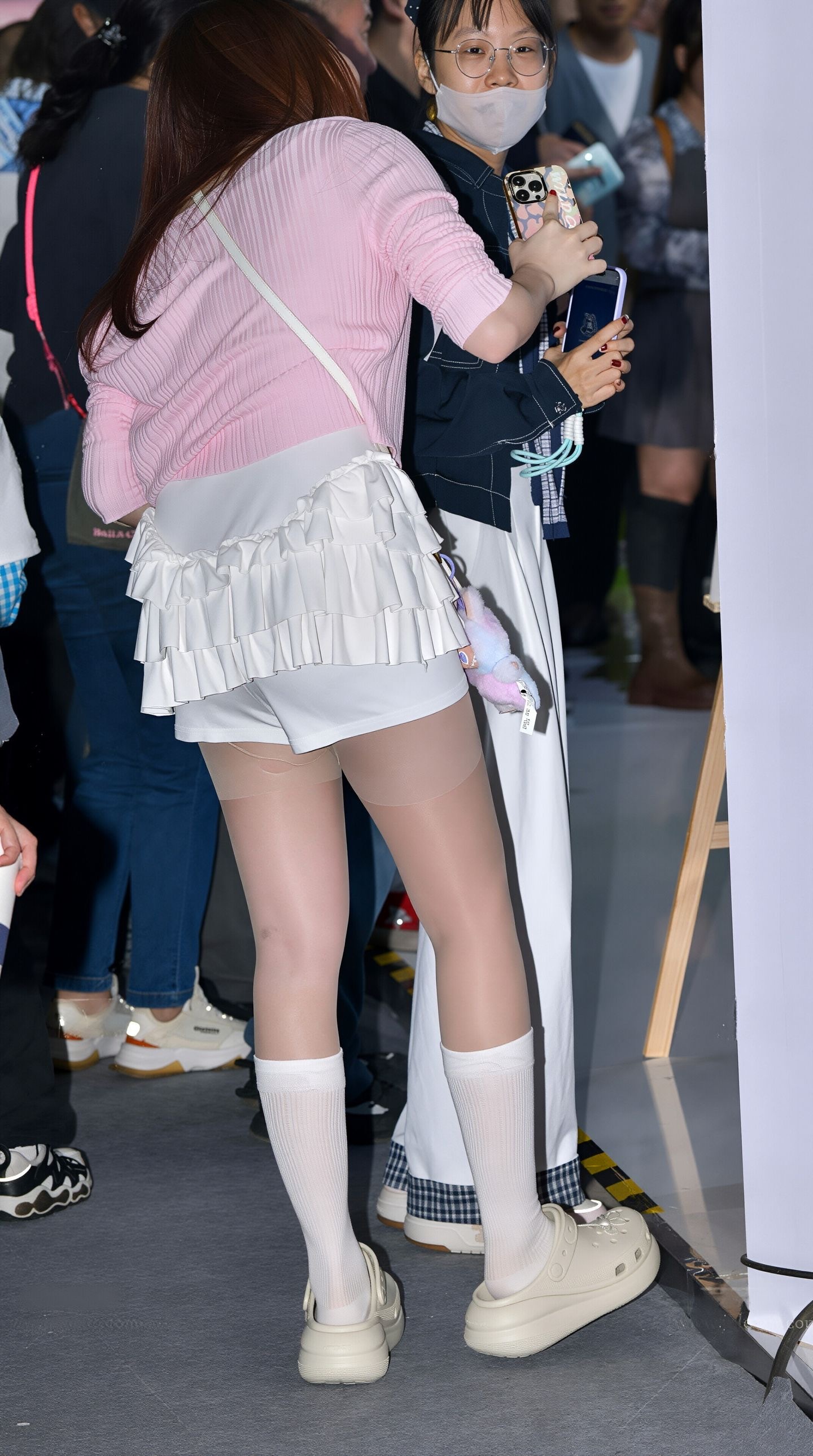 粉色针织开衫搭配白色荷叶边短裤街拍美女穿搭时尚穿搭