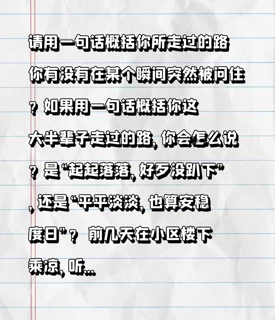 请用一句话概括你所走过的路 你有没有在某个瞬间突然被问住?如果用一句话概括你这大半辈子走过的路,你会怎么说?是“起起落落,好歹没趴下”,还是“平平淡淡,也算安稳度日”? 前几天在小区楼下乘凉,听几位大爷大妈闲聊这个话题,有人笑着说“瞎混呗”,有人叹着气讲“一步一个坑”,还有人红了眼眶,半天憋出一句“苦过累过,幸好家人都在”。 其实我们每个人的路,都藏着说不完的故事。就像楼下的王大爷,年轻时当过兵、下过岗,中年时为了给儿子凑学费,凌晨三点就去批发市场摆摊卖菜,冬天冻得手脚开裂,夏天晒得脱了几层皮。他总说自己这辈子太苦,没什么值得炫耀的。 可转折点就在去年,他儿子带着妻儿从外地回来,特意给他办了场60岁寿宴。宴会上儿子举起酒杯说:“我爸这辈子,没干过什么惊天动地的大事,但他靠一双手,把我们兄妹仨养大成人,供我们读书,让我们在城里安了家。我爸的路,就是最了不起的路!” 那一刻,王大爷哭得像个孩子。他突然明白,那些咬牙熬过的苦、默默扛下的难,从来都不是白走的。 我们总想着用一句惊艳的话概括自己的人生,可到最后才发现,最动人的那一句,从来都不是什么豪言壮语。它可能是“三餐四季,家人在侧”,可能是“跌跌撞撞,依旧向阳”,也可能是“平凡一生,无愧于心”。 这世上没有一模一样的路,却有一模一样的坚持。你走过的每一步,无论是顺遂还是坎坷,都在塑造独一无二的你。那些流过的汗、擦过的泪,那些咬牙坚持的日日夜夜,都是生命里最珍贵的印记。 现在,也请你静下心来想一想,如果用一句话概括你所走过的路,你会怎么说?不妨在评论区留下你的答案,我们一起聊聊那些藏在岁月里的故事。觉得我说得对的朋友,点赞收藏,转给身边的人,愿我们都能在自己的路上,走得坦荡,活得精彩!