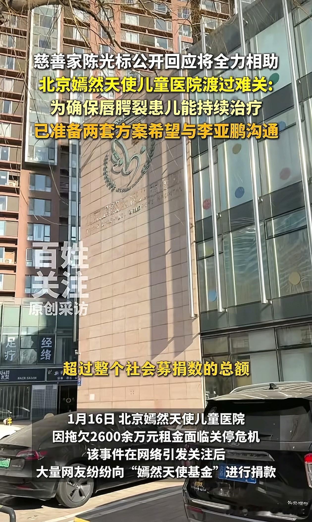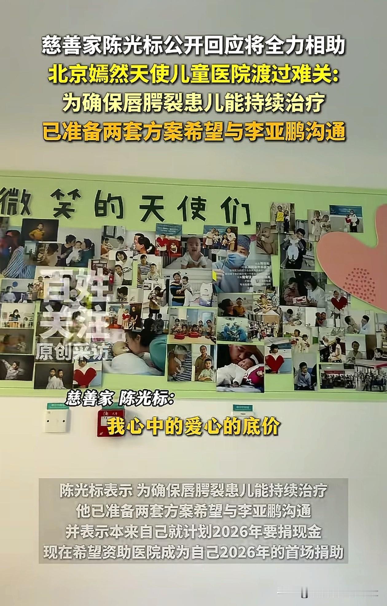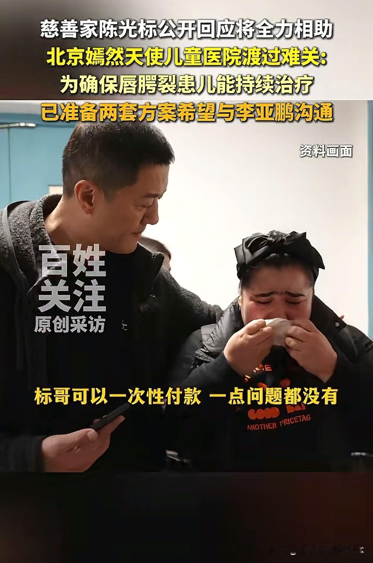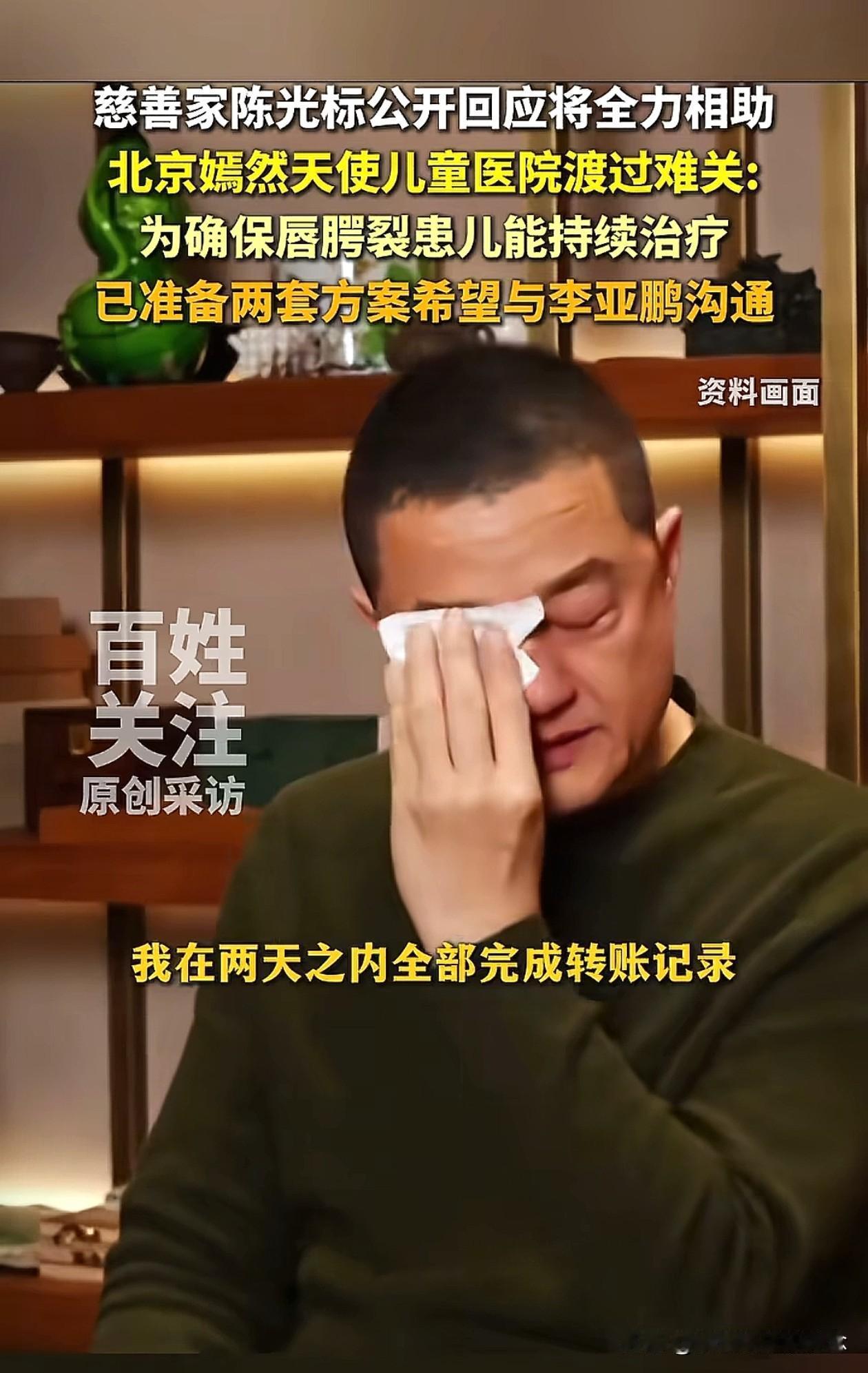 嫣然儿童医院有救了, 陈光标已准备好两套方案, 第一个方案,他资助的金额会超出社会募捐的总和,两天之内完成转账。 第二个方案,全资收购,由他来安排医生来经营,招聘有爱心的医生来管理。 今天,陈光标喊话李亚鹏,愿意为他提供帮助。他接受“百姓关注”记者采访时说,他准备了两套方案等着和李亚鹏沟通。一是直接捐款,而是全资收购。 有的网友说,这次有陈光标兜底,嫣然儿童医院一定能渡过难关。 也有网友说,要捐就捐吧,像李国庆一样直接把转账记录晒出来,你还没捐,就先把视频晒出来,还喊话李亚鹏给他账号。 大家觉得陈光标的这两个方案可行吗?会帮嫣然儿童医院渡过难关吗?