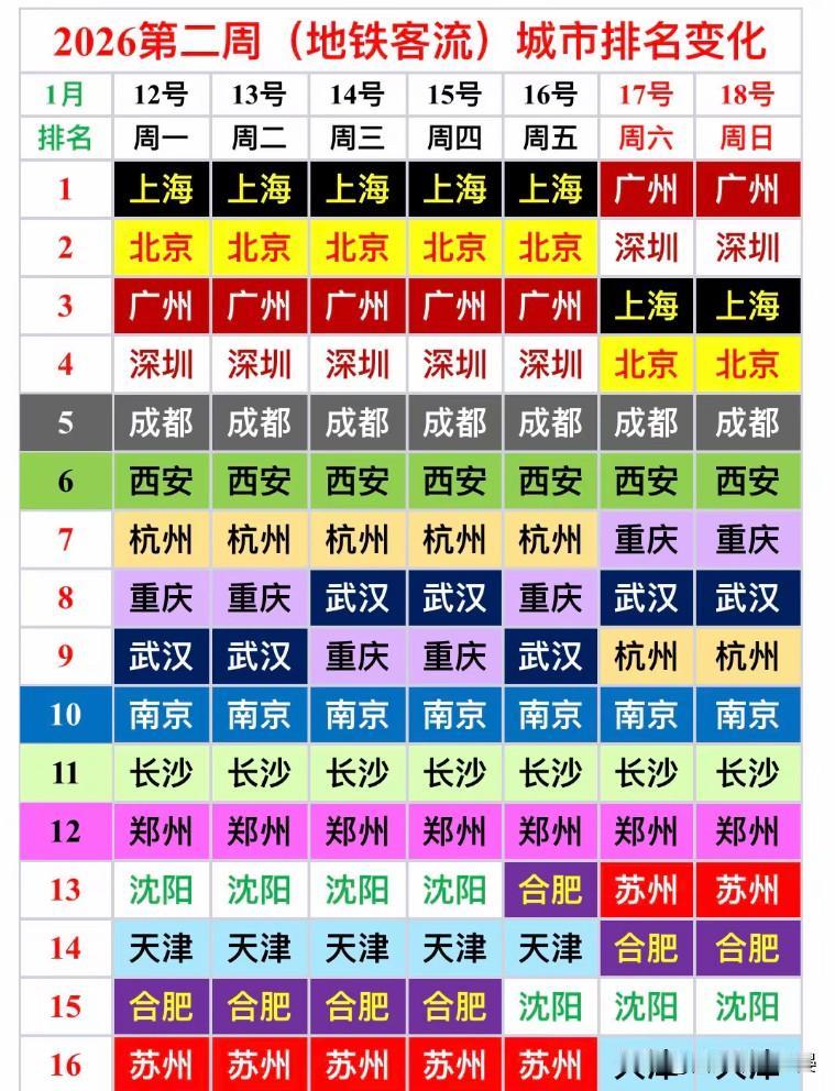 2026第二周地铁客流榜出炉:西安稳坐第6,广州周末反超上海 2026年第二周全国地铁客流排名新鲜出炉!这份榜单不仅记录了城市通勤的日常,更藏着周末消费活力的秘密。 先看工作日格局:周一到周五,上海、北京、广州、深圳稳稳占据前四,成都、西安紧随其后,排名纹丝不动。这种“钉死”的位次,完全是通勤客流的惯性体现——上班族的早出晚归,让城市地铁客流保持着极强的稳定性。值得一提的是,西安连续7天稳居第6,不仅把杭州、重庆甩在身后,更印证了地铁8号线开通后线网效率的提升,无论是通勤还是文旅出行,都撑起了稳定的客流底盘。 周末的反转才是重头戏!周六、周日两天,广州直接反超上海登顶,深圳守住第二,上海、北京纷纷下滑。这背后是广州、深圳旺盛的夜间经济和消费活力——珠江新城、华强北的商圈人流,琶洲、南山的文旅活动,让周末客流彻底爆发。对比之下,上海、北京的周末客流更多依赖本地休闲,爆发力稍显逊色。 此外,重庆和武汉的位次拉锯、苏州和合肥的周末逆袭,也让榜单充满看点。这些细微变化,正是城市活力的晴雨表。西安能在强手如林的新一线城市中稳住第6,既靠成熟的地铁线网,也离不开文旅消费的持续升温。 西安地铁 城市客流 2026地铁排名 新一线城市