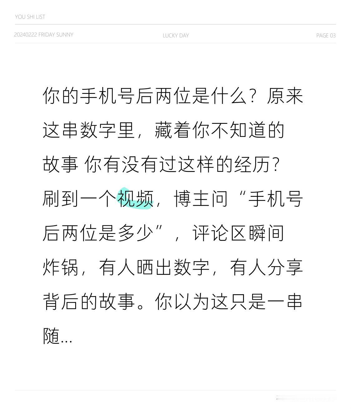 你的手机号后两位是什么?原来这串数字里,藏着你不知道的故事 你有没有过这样的经历?刷到一个视频,博主问“手机号后两位是多少”,评论区瞬间炸锅,有人晒出数字,有人分享背后的故事。你以为这只是一串随机的数字?其实,它藏着我们的青春、遗憾和念念不忘的人。 前几天,我在小区碰到快递员小张,他正对着手机叹气。聊起来才知道,他用了十年的手机号,后两位是“17”。这个数字,是他初恋女友的生日。当年两人分手,他赌气换了城市,却唯独没舍得换手机号。他说,总觉得万一她找他,还能打通。 这十年里,他换了三份工作,搬了五次家,从青涩少年变成了扛起家庭的男人,可那个号码,始终没换。直到上个月,他接到一个陌生电话,对方开口就问:“请问是小张吗?我是xx的妈妈,她……” 小张的心一下子提到了嗓子眼,结果对方说,女孩已经结婚生子,过得很幸福,清理旧物时看到了写着这个号码的纸条,特意打来问问。挂了电话,小张愣了半天,突然笑了。他说,那一刻他才明白,自己守着的不是号码,而是那段回不去的青春。 你看,手机号后两位,哪是什么随机数字?它可能是你大学宿舍的门牌号,是你第一份工作的入职日期,是你孩子的出生日,也可能是你再也联系不上的人的纪念日。 有人的后两位是“00”,那是他和妻子领证的年份,十年婚姻,吵过闹过,却始终把彼此放在心上;有人的后两位是“24”,那是他创业失败的日子,也是他重新出发的起点;还有人的后两位是“66”,普普通通的吉利数,却陪着他熬过了最难的失业期。 我们总以为,日子是一天一天过的,可那些藏在数字里的记忆,却在不经意间,拼凑出了我们的整个人生。这串数字,见证了我们的喜怒哀乐,也记录了我们的成长蜕变。 现在,不妨拿出你的手机,看看后两位是什么?评论区告诉我,这串数字背后,藏着你的什么故事? 也许你会发现,那些看似不起眼的数字,早已和你的人生紧紧绑在一起。点赞收藏这条视频,转给你想分享的人,一起聊聊那些藏在数字里的时光。愿我们都能在平凡的日子里,守住那些珍贵的记忆,活在当下,不负韶华!