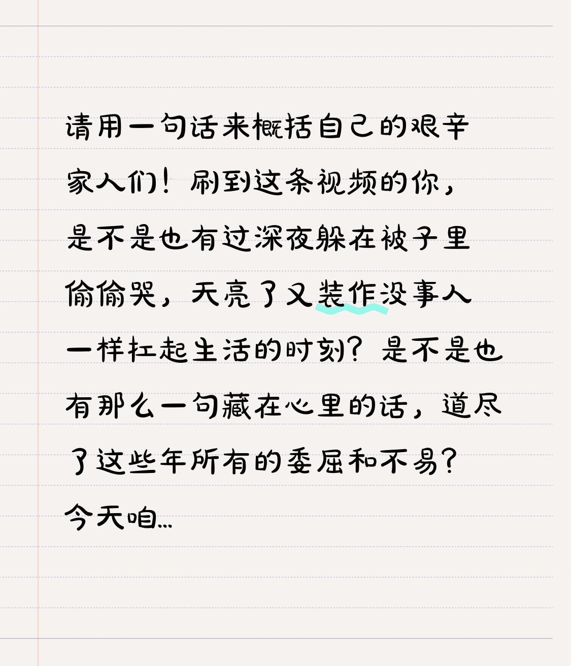 请用一句话来概括自己的艰辛 家人们!刷到这条视频的你,是不是也有过深夜躲在被子里偷偷哭,天亮了又装作没事人一样扛起生活的时刻?是不是也有那么一句藏在心里的话,道尽了这些年所有的委屈和不易?今天咱们不聊大道理,就说说普通人的那些艰辛,看看哪一句戳中了你的心窝! 你以为的光鲜亮丽,背后全是咬紧牙关的硬扛。有人说“成年人的世界,哭都是静音模式”,这话真的太戳心了。你可能每天挤两个小时地铁上下班,为了多赚几百块加班费熬到凌晨;可能明明受了委屈,还要笑着跟客户说“没关系”;可能看着父母鬓角的白发,孩子期盼的眼神,再苦再累也不敢说一个“难”字。我们总觉得,把艰辛说出来就是矫情,可谁又知道,那些咽下去的眼泪,都变成了心里的伤疤。 但这里有个转折——所有的艰辛,从来都不是白受的!你熬夜做的方案,让你拿到了升职加薪的机会;你咬牙扛过的低谷,让你变得更坚韧更强大;你默默付出的那些时光,都在悄悄为你铺路。那些说不出口的艰辛,其实都是你成长的勋章。就像有人说“我曾踏遍山海,才懂风的自由”,没有熬不过的黑夜,只有等不来的黎明吗?不,黎明总会来,只要你肯坚持。 其实我们都一样,都是在生活里摸爬滚打的普通人。我们的艰辛,没有惊天动地的故事,却满是烟火气的真实。可能是一句“钱难赚,屎难吃”的自嘲,可能是“为了碎银几两,压弯了脊梁”的无奈,也可能是“我还好”背后的“我好累”。 评论区里留下那句能概括你艰辛的话吧,或许有人懂你的言外之意,有人疼你的欲言又止。记住,你吃过的苦,都会变成照亮前路的光。关注我,下次咱们聊聊那些艰辛过后,你赚到的人生底气!