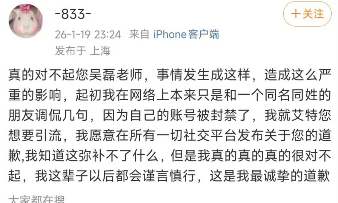 白珊珊给吴磊道歉了,说是和一个同名同姓的朋友调侃了几句,为了引流艾特了吴磊。。。。。离谱,这样的多了,以后就是狼来了。这次最大的受害者是吴磊,成毅也受到了波及,他俩完全是纯纯的无妄之灾。