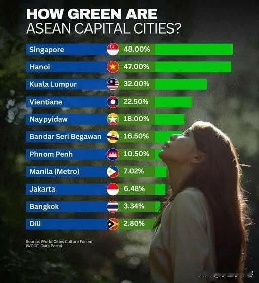 《中国台湾地区及东南亚首都城市的绿化率》 世界城市文化论坛(World Cities Culture Forum)的资料显示: 台湾地形多山(山地约占2/3),气候属亚热带至热带季风气候,天然植被恢复能力强,台湾整体非常“绿”,森林覆盖率超60%。台北市作为高密度都市,虽受限于土地开发,但通过大型公园与保留郊山,仍维持了15%以上的绿色空间。 东盟各首都城市在公共绿地供给方面存在显著差距。一些城市已成功将自然融入都市肌理,而另一些则因高密度开发,几乎未给生态景观留下空间。 区域内表现领先的是新加坡、河内和吉隆坡,彰显出对城市可持续发展的坚定承诺。其中,新加坡以48.00%的绿化覆盖率位居榜首,河内紧随其后,达47.00%,吉隆坡则以32.00%位列第三。 相比之下,曼谷(3.34%)和帝力(2.80%)的公共绿色廊道最为匮乏。 这些资料凸显了通过战略性城市规划来改善空气质量、提升居民福祉的迫切需求。 (数据源自网络,仅供参考)