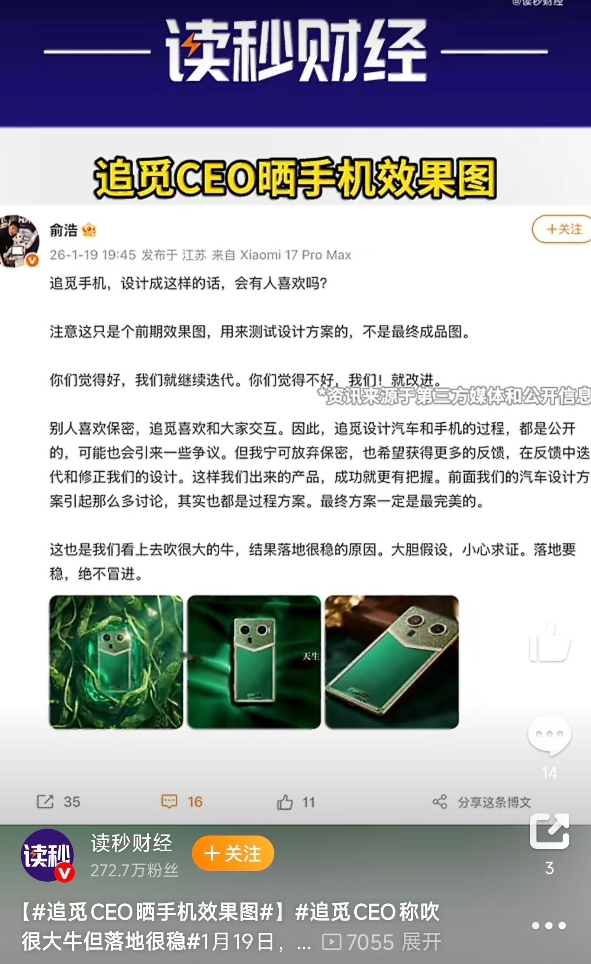 “追觅手机,设计成这样的话,会有人喜欢吗?注意这只是个前期效果图,用来测试设计方案的,不是最终成品图。”各位觉得咋样?你们会买吗?