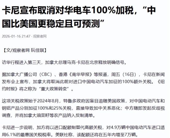 重大转向!中加签2000亿协议,加取消对华加税,特朗普回复一句话   “抱着美国大腿没捞着好,反而丢了中国市场。” 这是加拿大商界的共识。要知道中国可是他们第二大贸易伙伴,2024 年双边贸易额就有 930 亿美元,原油出口有时比美国还多,TMX 液化天然气项目的最大买家也是中国。   卡尼上台后总算想明白了,去年 10 月直接宣布要在 2035 年把对美以外市场的出口翻一倍,说白了就是不想再被美国卡脖子了。这次访华更带着 “全家桶” 阵容,外交、农业、能源等多个内阁部长全来了,连油菜籽主产区的省长都跟着,摆明了是来 “补损失” 的。   除了这些 “低垂的果实”,双方还签了 8 份合作文件,从能源到文旅无所不包。要知道加拿大的石油、矿产跟中国的新质生产力需求简直是 “天作之合”,中国 “十五五” 规划里的科研、海洋治理等领域,加拿大正好有优势。卡尼在签约仪式上说得直白:“中国比美国更稳定且可预测。”   这话戳破了西方盟友的心声,在美国政策一天三变的当下,中国的市场确定性比什么都珍贵。   国内民调早就印证了这一点:益普索的数据显示,54% 的加拿大人支持对华签贸易协定,超过 60% 的人想取消电动车关税。   不过分歧也不是没有,安大略省的汽车业就抱怨 “抢了本土市场”,但比起全国农民的呼声,这点反对声根本掀不起浪。毕竟对加拿大来说,能同时拿到能源出口市场、农产品销路和新能源技术,这笔买卖太值了。   中加这边刚签字,美国那边就炸了锅。美国贸易代表格里尔先跳出来骂 “这是个问题”,对着电动车配额破口大骂;交通部长更酸溜溜地放话 “加拿大肯定会后悔”。可轮到特朗普回应时,却来了个 180 度大转弯:“这没问题,卡尼就该这么做,能和中国达成协议是好事。”   这话听着敞亮,实则一肚子算计。清华教授达巍早看透了,特朗普现在满脑子都是国内议题,只要不直接损害美国利益,对盟友的 “小动作” 暂时懒得管。   更关键的是,美加关系本就紧张,特朗普前阵子还喊着要 “接管委内瑞拉油气”,等于断了加拿大石油对美出口的后路,现在要是再逼加拿大,万一人家彻底倒向中国,损失更大。   不过老谋深算的特朗普哪会真心放手?之前他也说过 “不干涉中委石油贸易”,转头就逼委内瑞拉跟中国断交,这次保不准过阵子就会拿钢铝关税要挟加拿大 “补偿损失”。   这种矛盾恰恰暴露了美国同盟体系的裂痕。中国人民大学王义桅教授说得对,加拿大这次是 “对过去政策的纠偏”,他们终于明白,跟着美国混不仅没好处,还得随时当 “炮灰”。现在加拿大 90% 的石油还得卖给美国,但中国市场的潜力摆在那,只要把对美依赖降下来,以后跟美国谈判腰杆都能硬点。   卡尼反复说的 “世界变了”,其实是个再简单不过的道理:单边主义玩不转了,跟着大国盲从只会坑了自己。过去加拿大把宝全压在美国身上,结果在全球供应链动荡中差点被拖垮;现在转头跟中国合作,既解决了国内经济难题,又找到了新的发展空间,这本身就是最务实的选择。   从国际格局看,这事儿更透着深意。中国经济的韧性摆在那,就算被美国加税也能保住产业链,这种稳定性正是加拿大最需要的。   而美国呢?一边破坏国际规则,一边对盟友敲竹杠,早就没了 “带头大哥” 的信誉。加拿大的转向不是个例,越来越多国家开始明白,与其在美日同盟、五眼联盟里当 “小弟”,不如跟中国搞务实合作来得实在。   不过也得清醒点,加拿大毕竟是美国的传统盟友,想完全摆脱影响不现实。美国在人工智能、关键矿产这些领域早给加拿大划了 “红线”,以后中加合作肯定会受隐性监控。但不管怎么说,2000 亿协议的落地、关税壁垒的打破,已经标志着加拿大迈出了关键一步。   就像 “尼米兹” 号航母摔了飞机灰溜溜回国,透着帝国衰落的影子;加拿大撕毁对华关税、主动抱中国市场大腿,也藏着世界格局的新变化。   依附别人的日子终究长不了,只有跟着市场走、跟对靠谱的伙伴,才能在动荡的世界里站稳脚跟。至于特朗普的那些 “好话”,听听就行,真到了利益冲突的时候,该防的还得防。