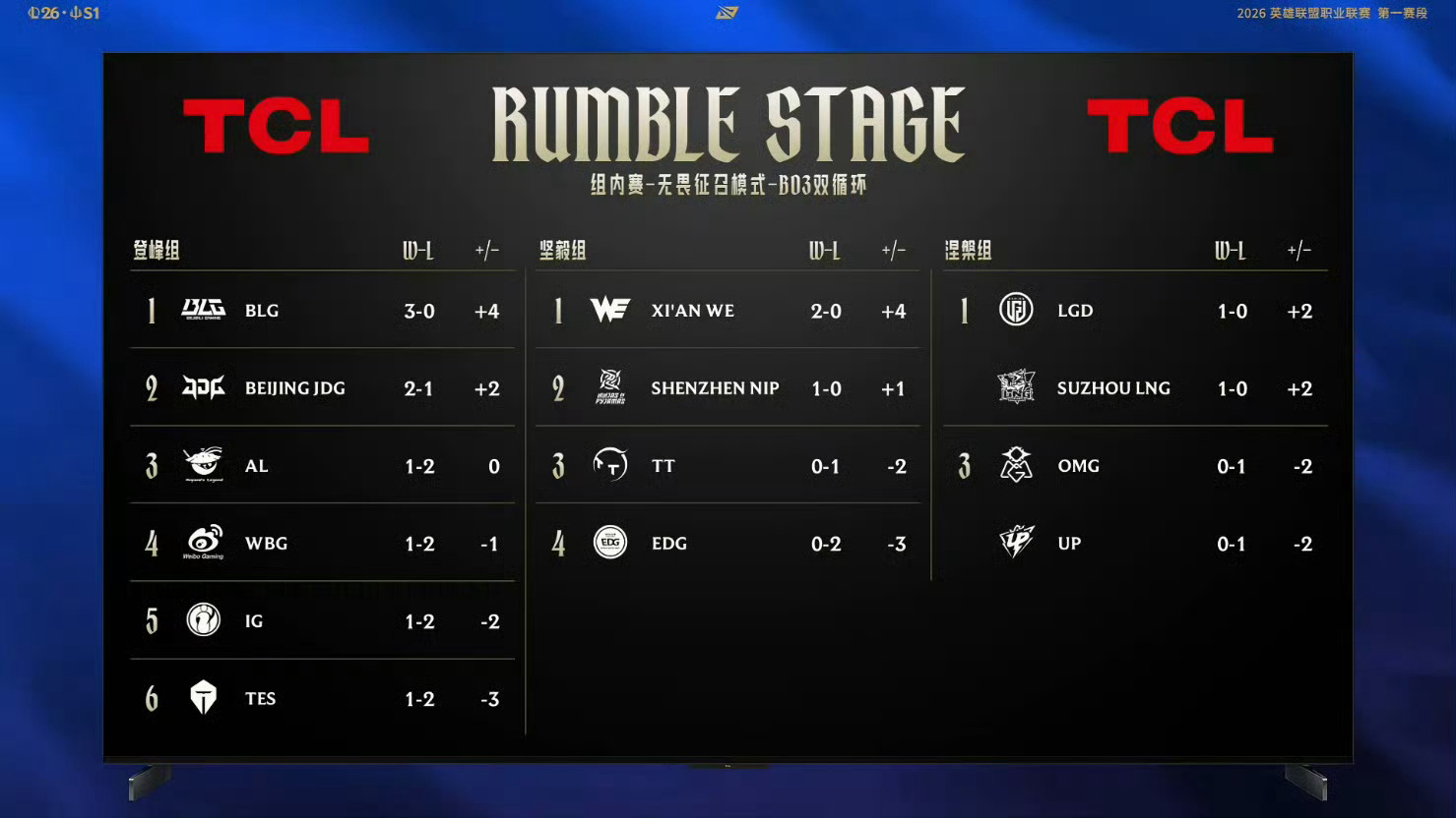 目前BLG领先登峰组第一,如果BLG今天对战IG赢下比赛将冲击四连胜,期待rookie和左手的对决blg冲击四连胜英雄联盟2026lpl