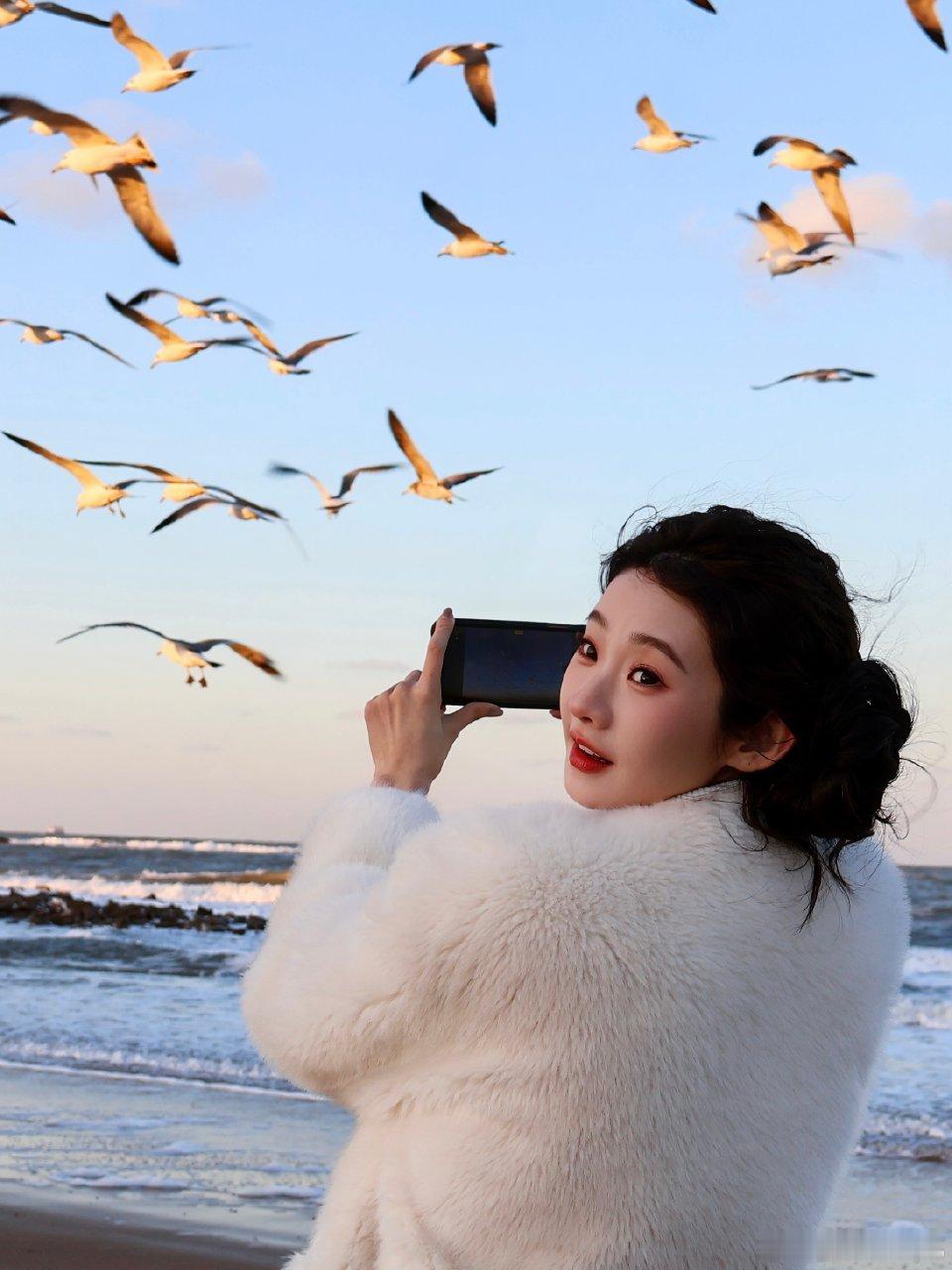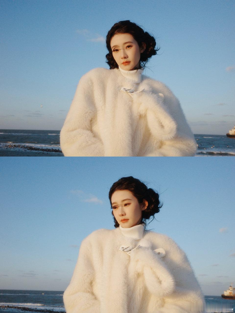 张艺凡咋萌成萨摩耶了 海风把她的绒毛帽吹出蓬松的涟漪,像萨摩耶奔跑时抖动的颈毛。她缩着脖子笑的瞬间,整个人裹在奶白色里,仿佛一颗刚在浪花里洗过的棉花糖。